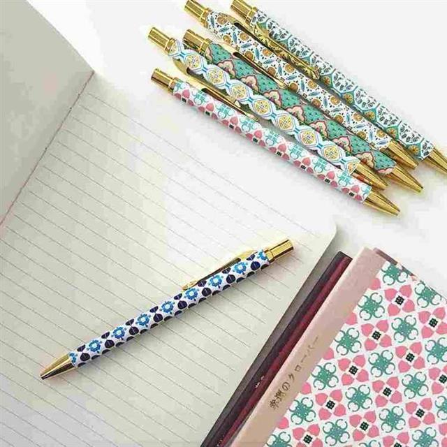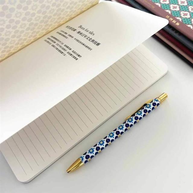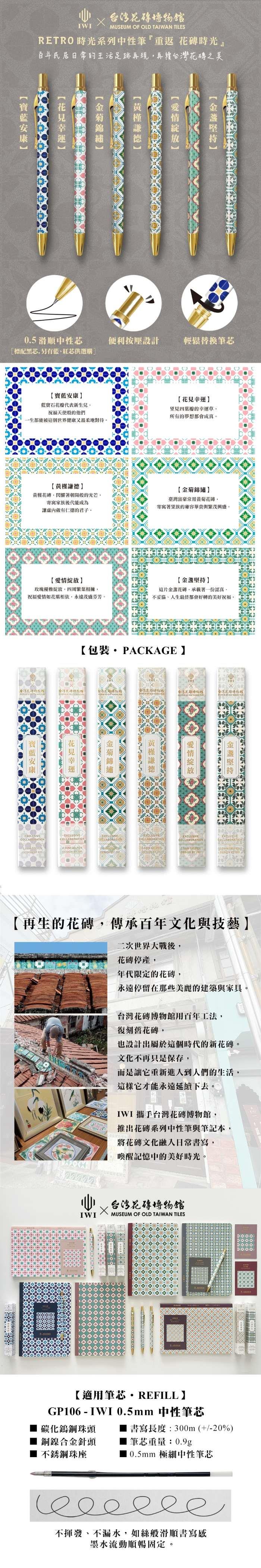 IWI與臺灣花磚博物館聯名-RETRO時光系列中性筆, 精選出花磚設計圖案印於鋁合金筆身並搭配復古造型設計筆夾,便利的按壓式結構及滑順0.5mm筆芯,讓您在書寫喚醒記憶中的美好時光。