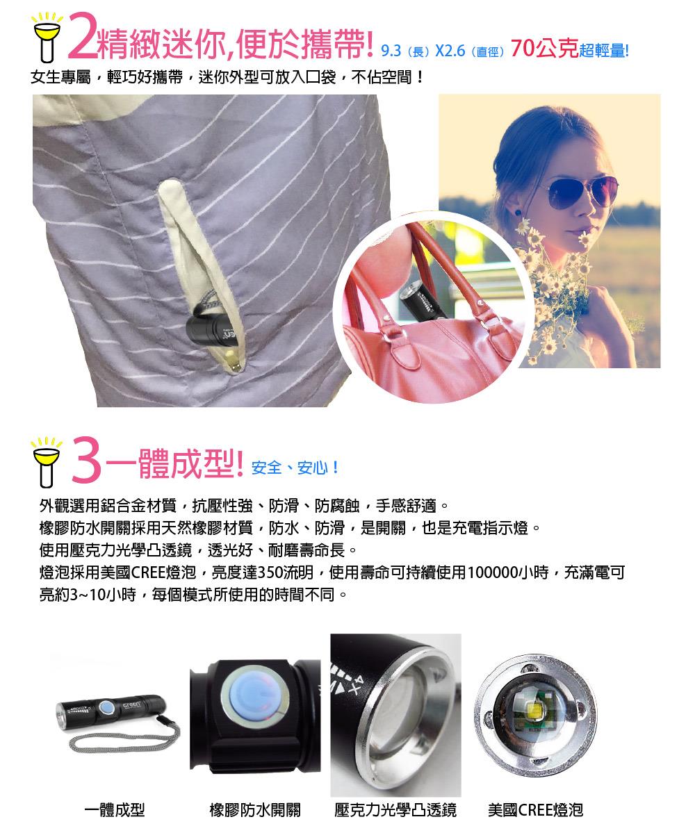 【GREENON 】強光USB充電變焦手電筒 精緻迷你,便於攜帶,小資女專屬