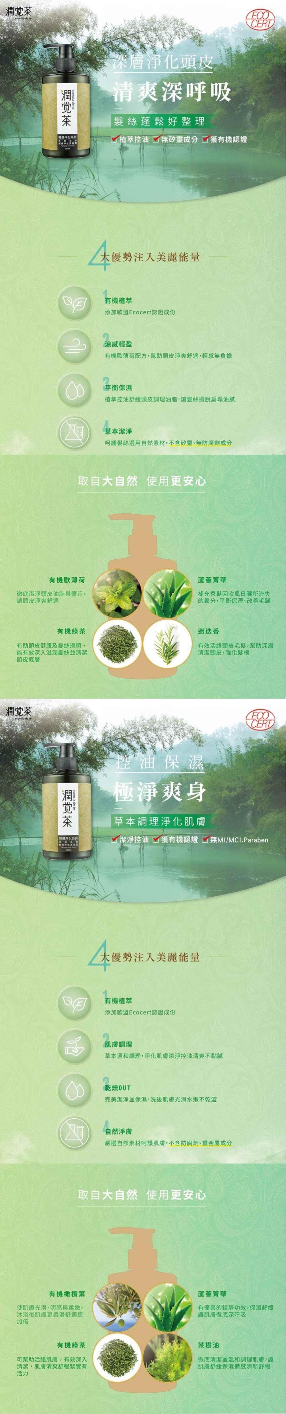 【茶寶 潤覺茶】茶樹輕感淨化控油完美優惠組(洗髮*1、沐浴*1、綠豆皂*1、護髮素*1)