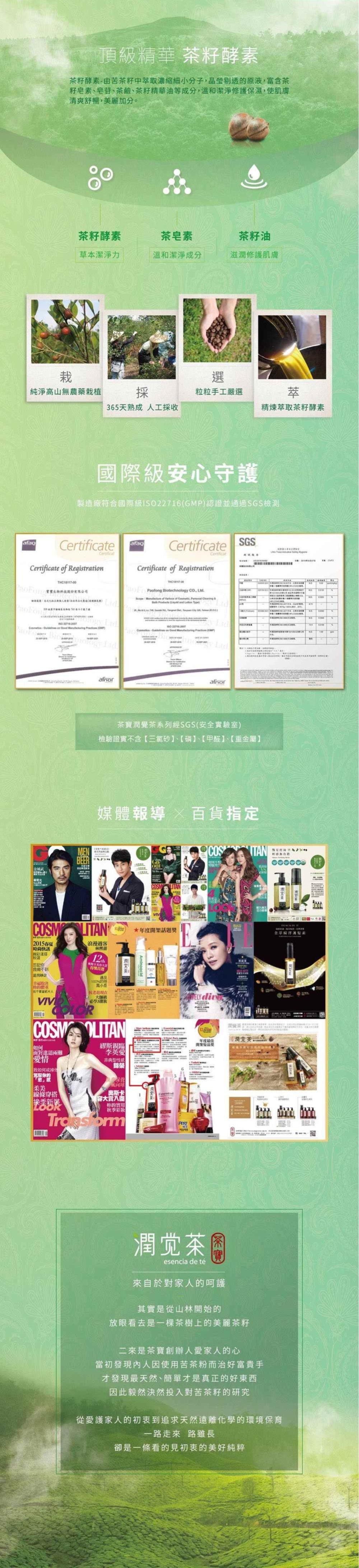全成份:純水/茶籽酵素(皂素)/椰子油衍生物(椰油醯胺丙基甜菜鹼)/山茶花油/亞麻籽油/海藻萃取液/海鹽/有機綠茶萃取物/蘆薈菁華/有機橄欖葉/金銀花菁華/小麥蛋白/維他命E/維他命A/柑橘菁華/茶樹菁華/月桃葉菁華