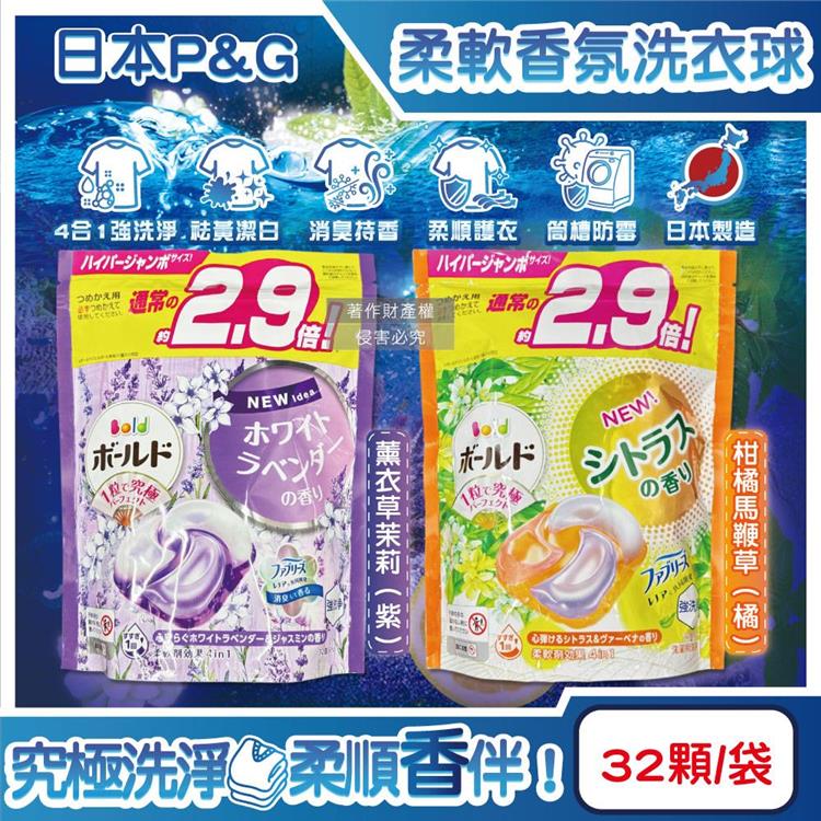 日本P&G-Bold強洗淨4合1消臭柔軟香氛洗衣凝膠球32顆/袋(家庭號補充包/防皺好熨燙柔順洗衣球/筒槽防霉洗衣膠囊/直立/滾筒式洗衣機皆適用)