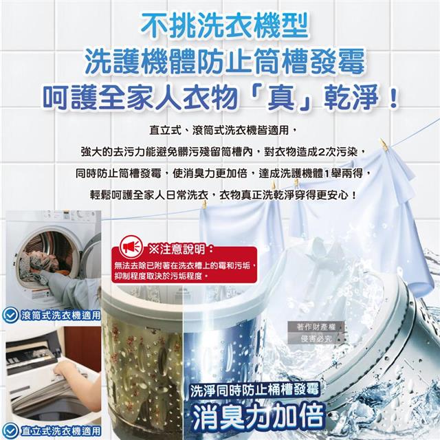 ●日本製造,不挑洗衣機型,遇水即溶不易沾手,洗護機體防筒槽發霉!
