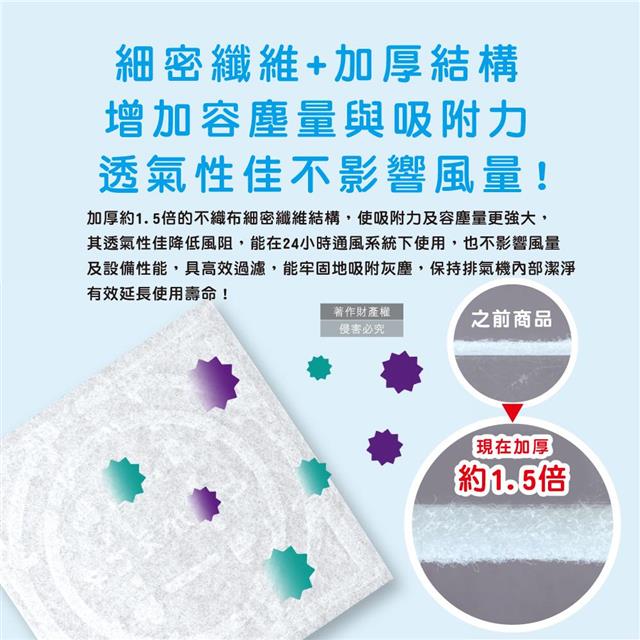 ●日本製造加厚細密結構,使容塵量大、吸附力強,透氣性佳、不降風量!