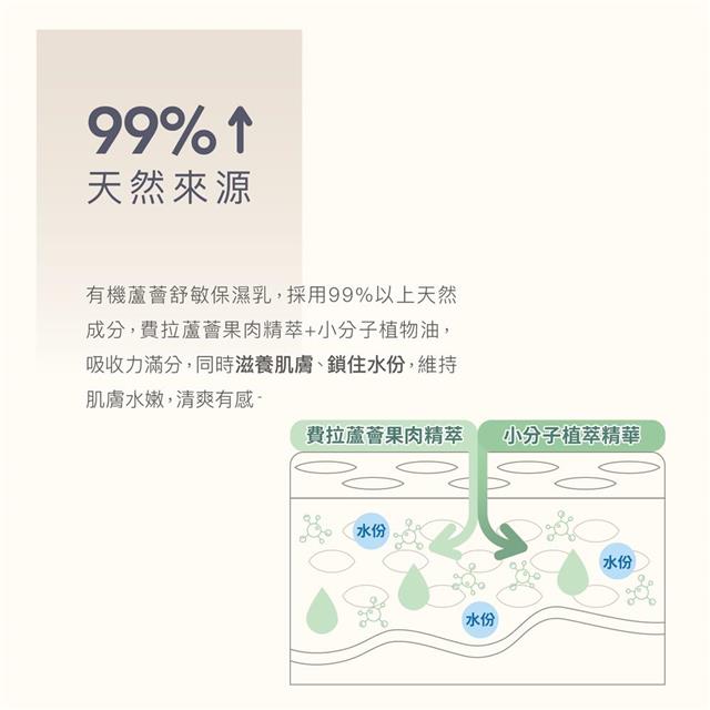 有機低敏、無香味、潤澤保濕、小分子好吸收 天然植物成分溫和潤澤 費拉蘆薈果肉萃取