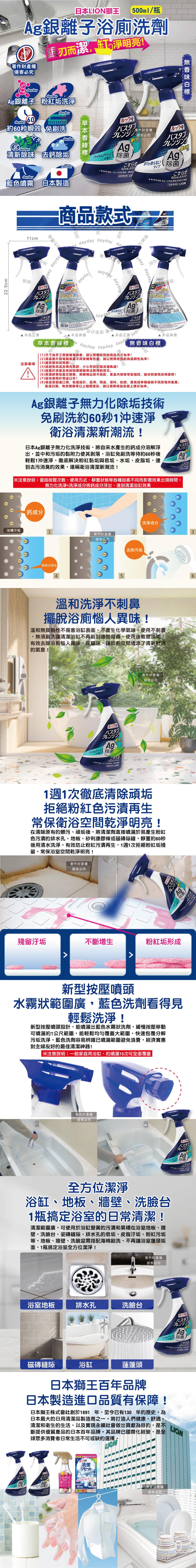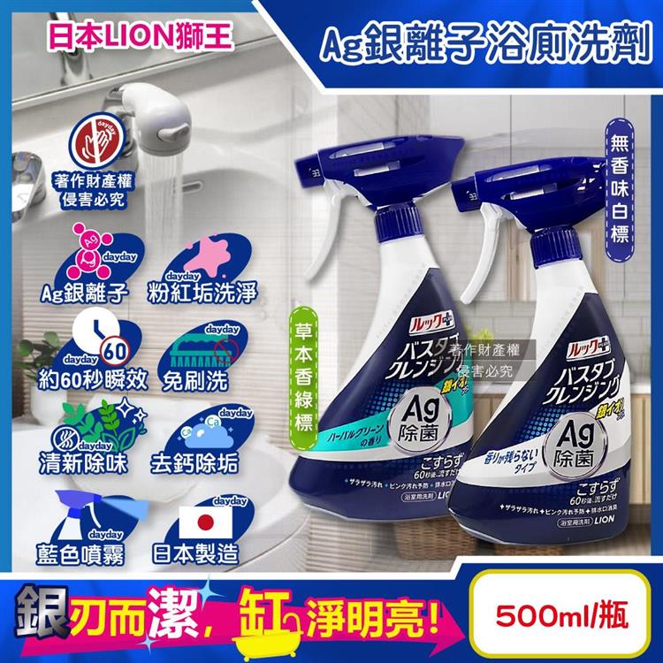 日本LION獅王-LOOK PLUS免刷洗Ag銀離子去除粉紅垢浴缸噴霧清潔劑500ml/藍瓶(約60秒瞬效洗淨版/衛浴清潔除水垢/浴廁地板牆面清新消臭)
