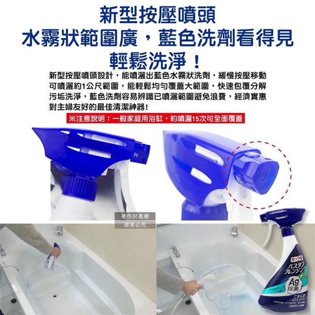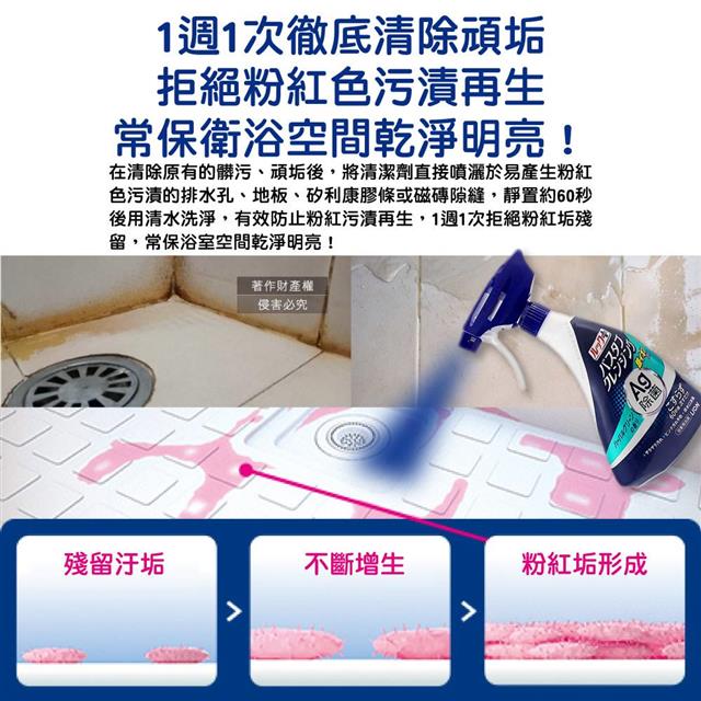 ●1週1次拒絕粉紅垢,藍色水霧狀噴灑均勻範圍廣,洗劑看得見真節省!