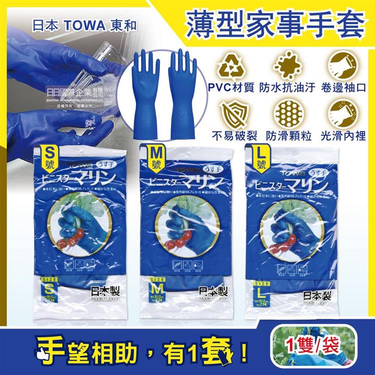 日本TOWA東和-PVC防滑抗油汙萬用家事清潔手套-NO.774薄型藍色1雙/袋(洗碗盤,大掃除,園藝植栽,漁業水產,油漆工作皆適用)