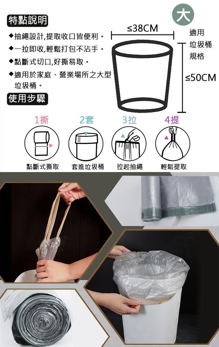 適用於家庭、辦公室、營業場所之寬38 x 高50cm大型垃圾桶,點斷式切口好撕易取,抽繩設計提取收口皆便利,一拉即收輕鬆打包不沾手,是您收納整理好幫手。