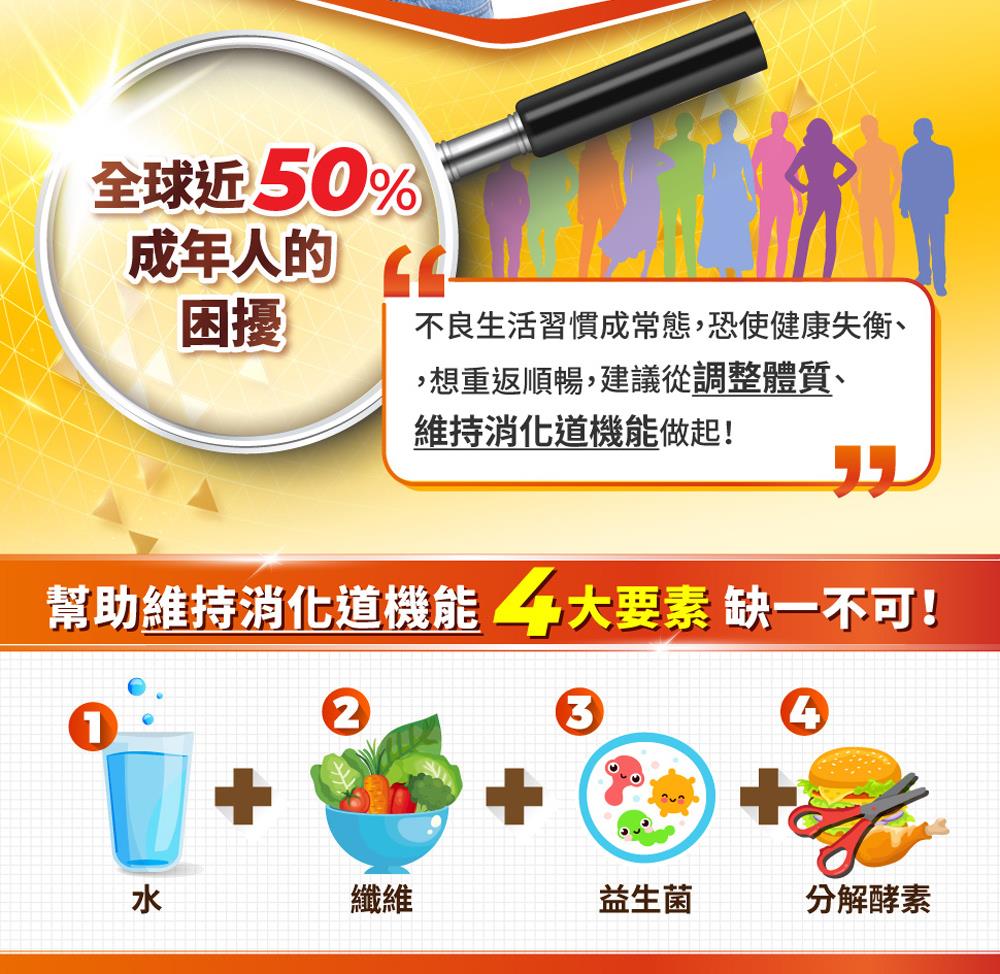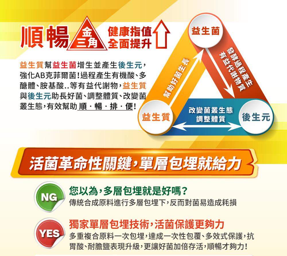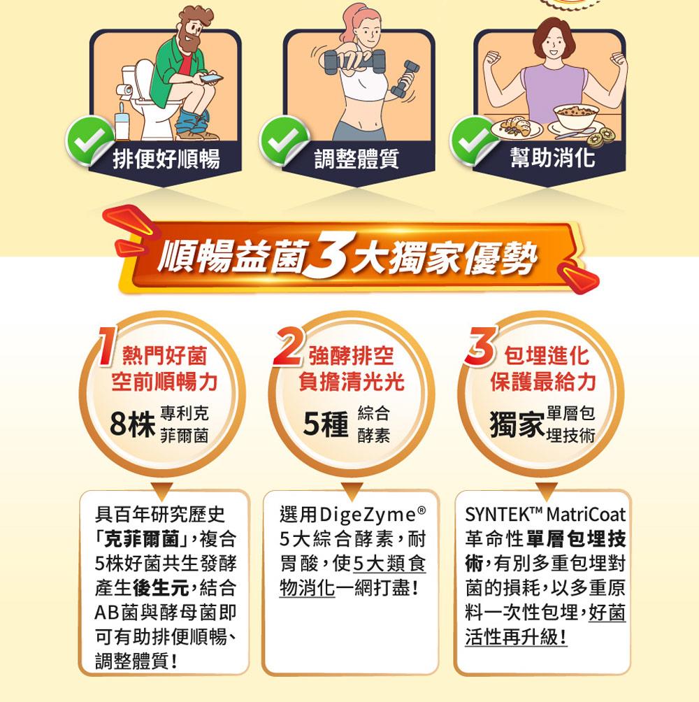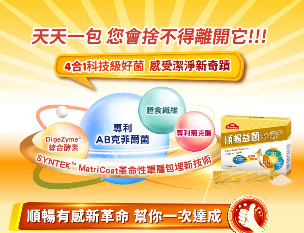 4合1科技級益生菌推薦,難解族的順暢新救星,天天餐前一包,讓您捨不得離開它!由8株專利AB克菲爾益生菌與5種DigeZyme綜合酵素,結合專利葡克醣與水溶性膳食纖維,強強聯手打造出順暢有感新革命!運用獨步業界最具抗胃酸、耐膽鹽的革命性單層包埋技術,讓好菌存活更加倍;克菲爾菌功效可維持消化道機能、幫助排便更順暢、促進新陳代謝與調整體質,無須冷藏,適合久坐、蔬果少吃、壓力大等族群,幫您改變菌叢生態、享受空前順暢感!