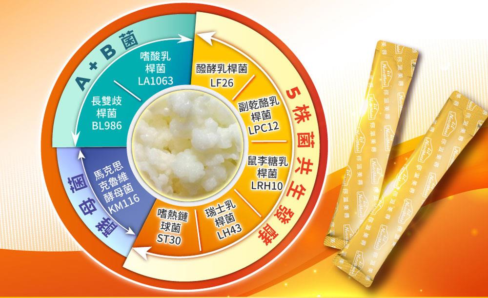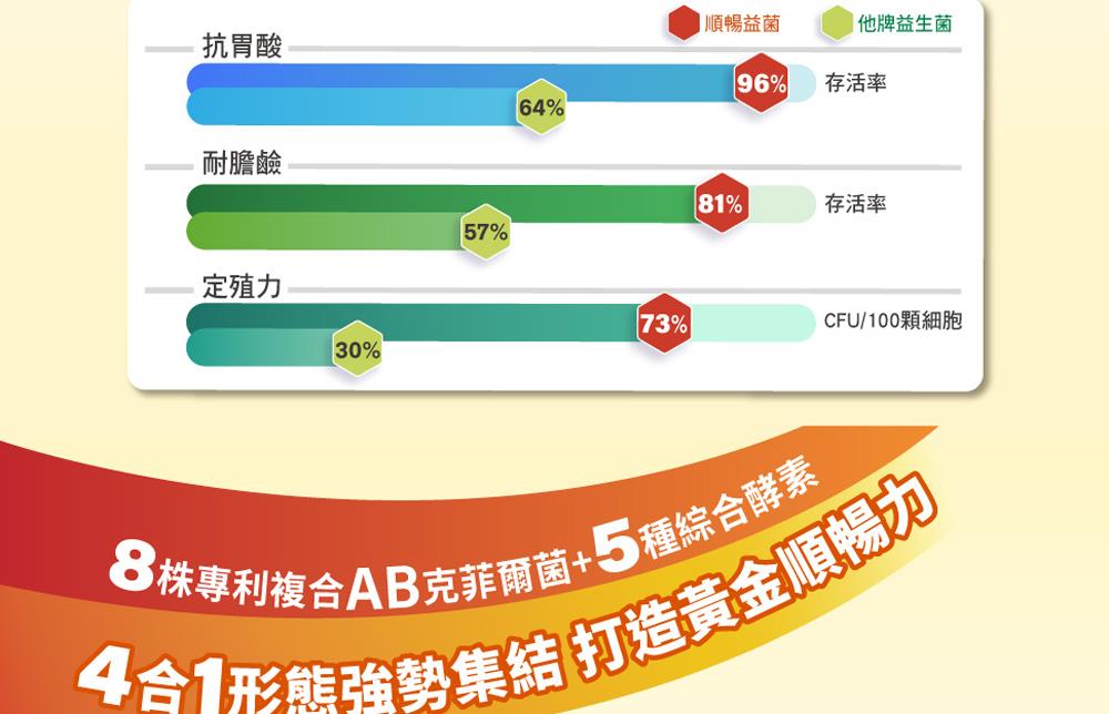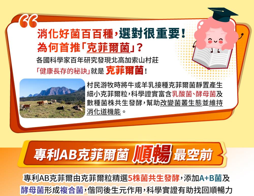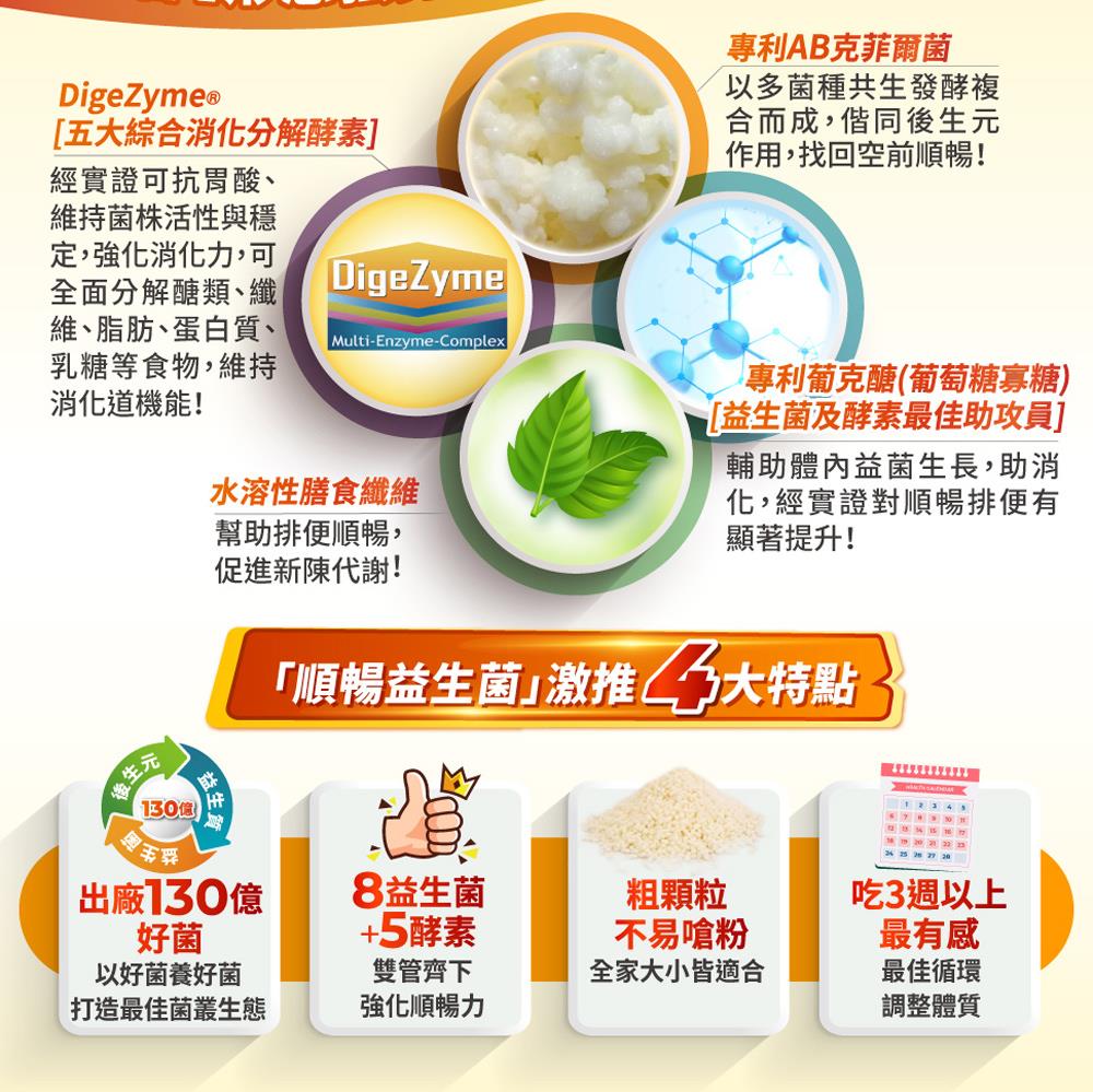 由8株專利AB克菲爾益生菌與5種DigeZyme綜合酵素,結合專利葡克醣與水溶性膳食纖維,強強聯手打造出順暢有感新革命