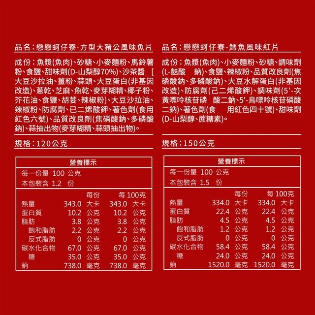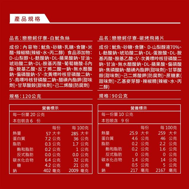 內容物:白魷魚絲、碳烤飛卷片、方型大豬公風味魚片、鱈魚風味紅片、香之魚