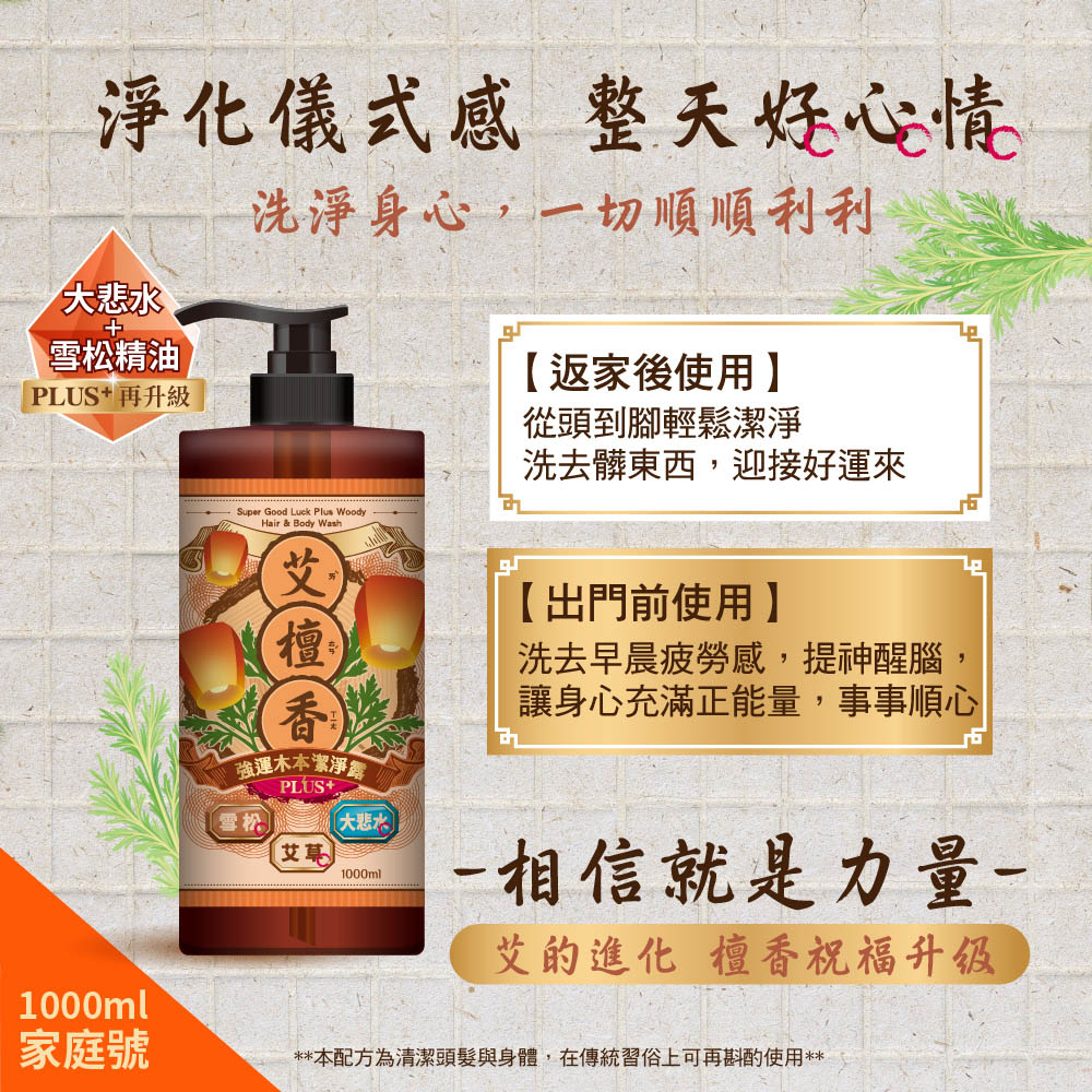 容量加大至1000ml,八重淨化成分再升級!添加大悲水及雪松精油,淨化加倍。
