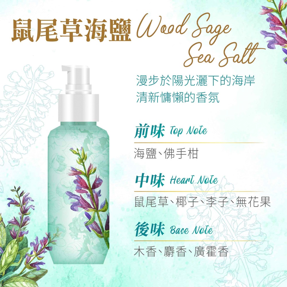 2.鼠尾草海鹽 極致奢華香氣-擁有精品香水多層次前中後調,揉合海鹽、佛手柑、鼠尾草、無花果等頂級香氣綻放