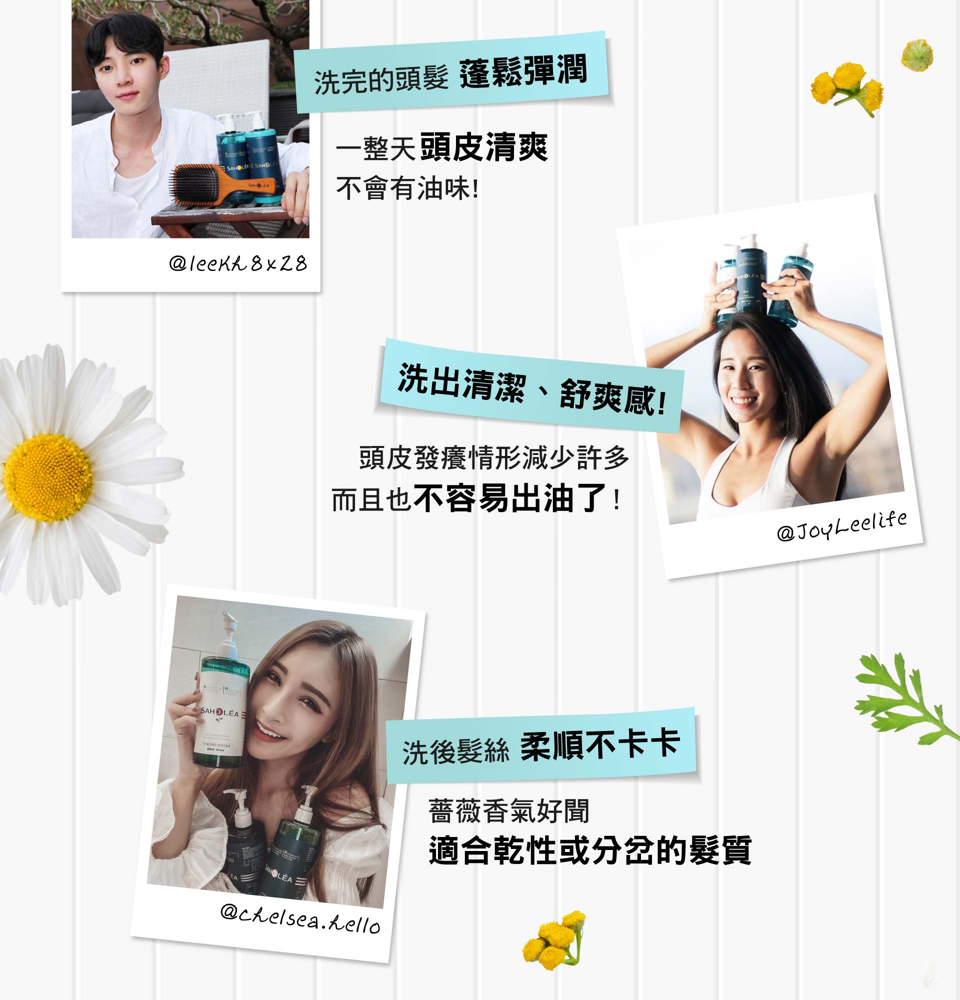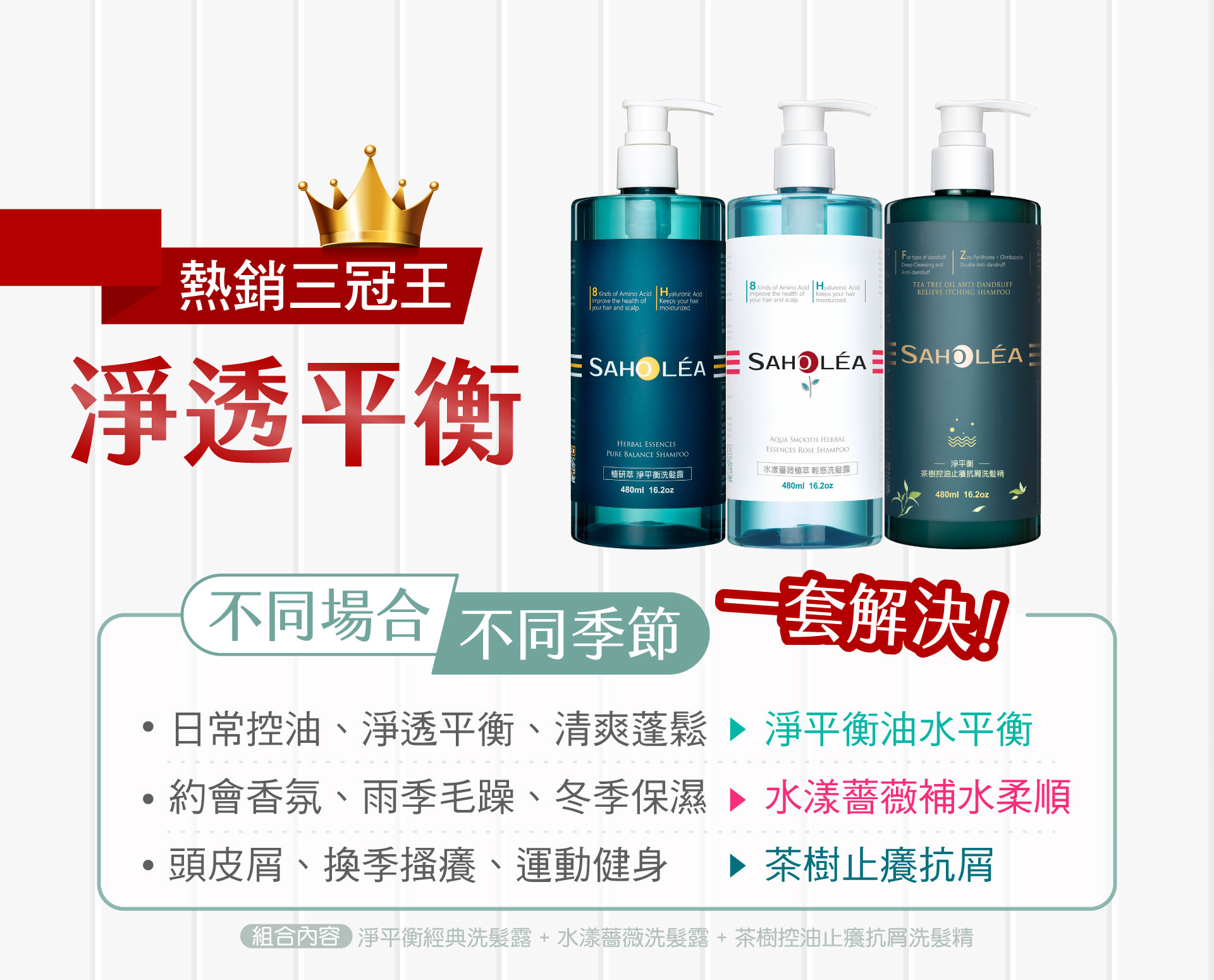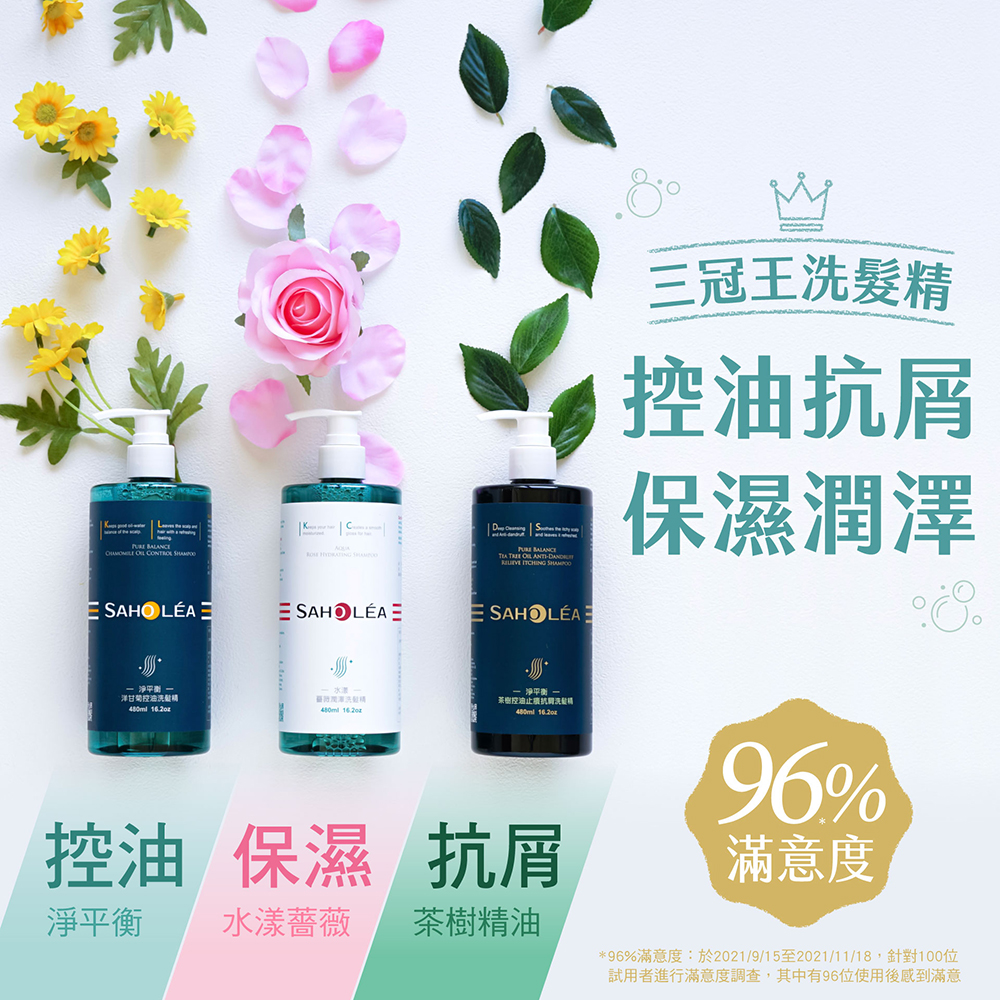 【森歐黎漾】三冠王洗髮精3件組〔水漾薔薇潤澤保濕+淨平衡洋甘菊控油蓬鬆+茶樹控油雙效抗屑〕 SAHOLEA (小明星大跟班/醫師好辣/一袋女王/節目推薦)