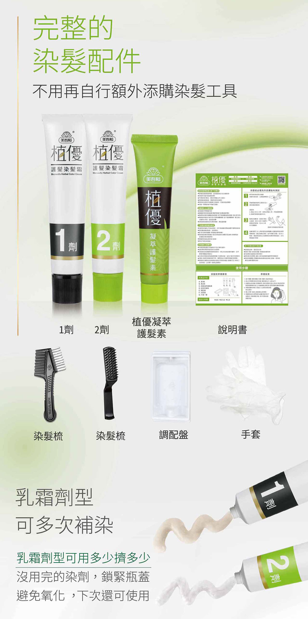每盒內容物:1劑&2劑各40g+護髮素28g+染髮梳+塑膠調配盤+手套+說明書採用花植菁萃溫和配方,雙重滋養,減低染劑對頭皮與頭髮傷害