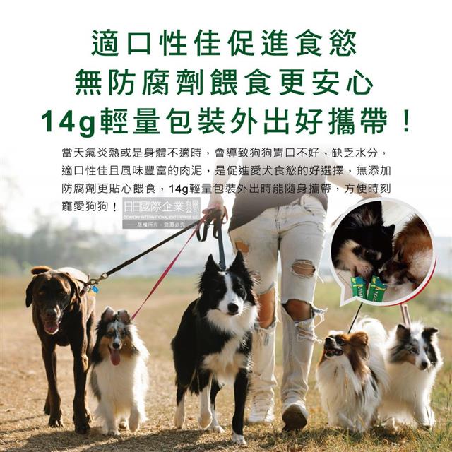 ●狗糧肉泥含水量約90%,添加綠茶消臭,14g獨立包裝新鮮衛生又便攜!