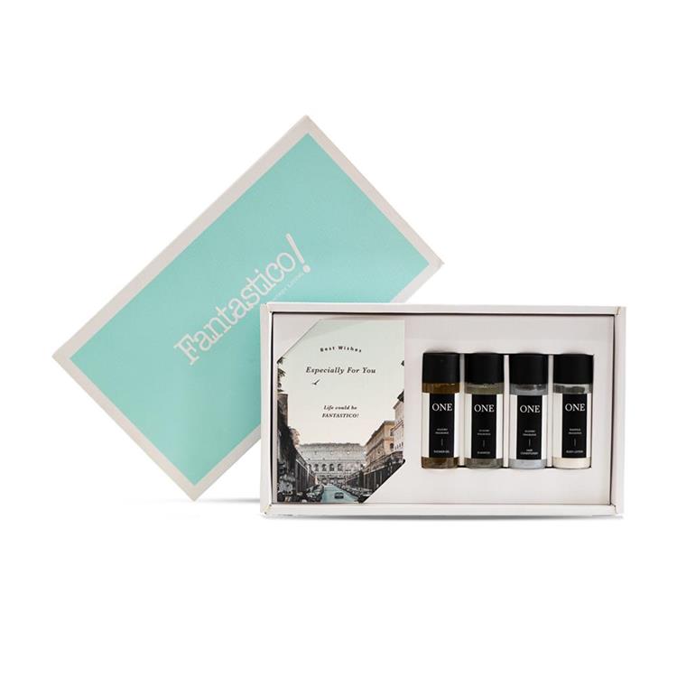包裝內容物:沐浴露30ml*1+潤膚乳30ml*1+洗髮精30ml*1+潤髮乳30ml*1+卡片*1