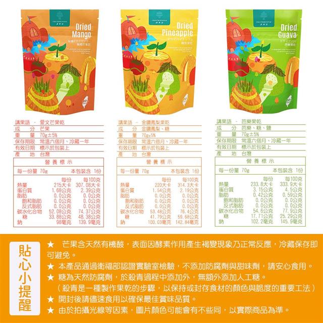組合內容/規格 : 柑甜蜜香紅(5克x7入) x1袋、翡翠檸檬綠(3克x 10入) x1袋、芭樂果乾(70g) x1袋、金鑽鳳梨果乾(70g) x1袋、愛文芒果乾(70g) x1袋