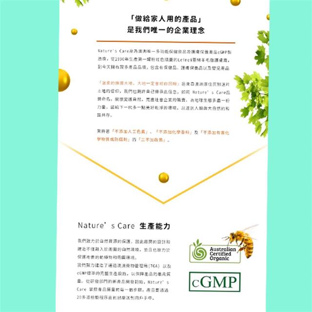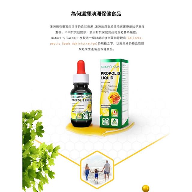 就是一般市面上說的蜂膠滴劑,但是這款的純度高、不含酒精,是澳洲Natures care使用最新的高科技製造高純度、高品質的 蜂 膠 滴 劑,不添加人工色素、不添加化學香料、不添加有害化學物質或防腐劑。