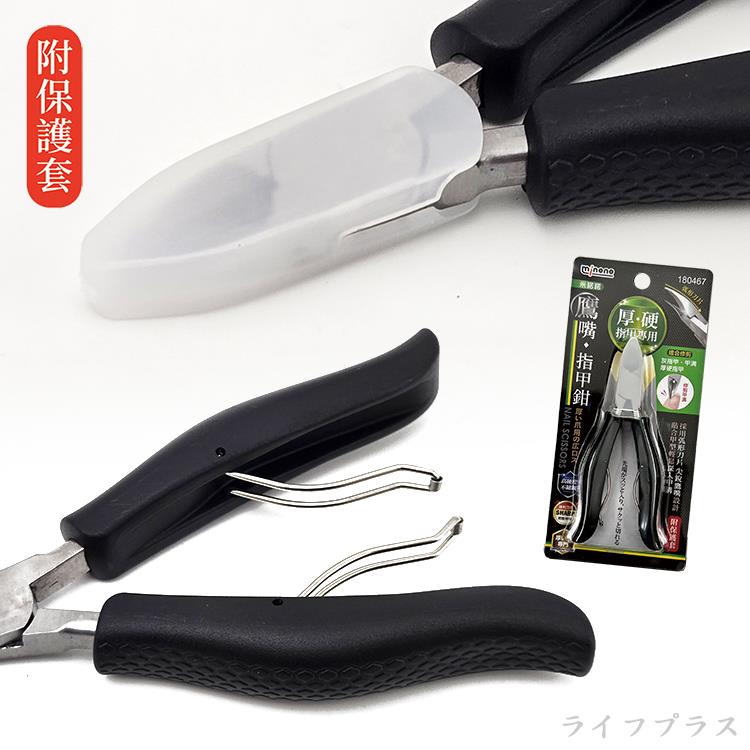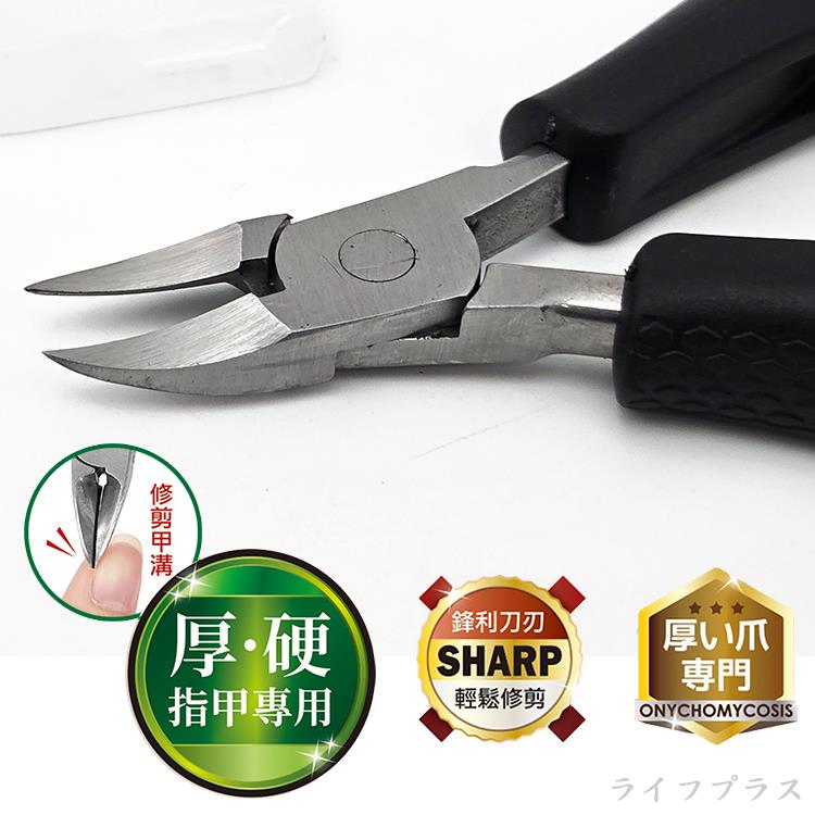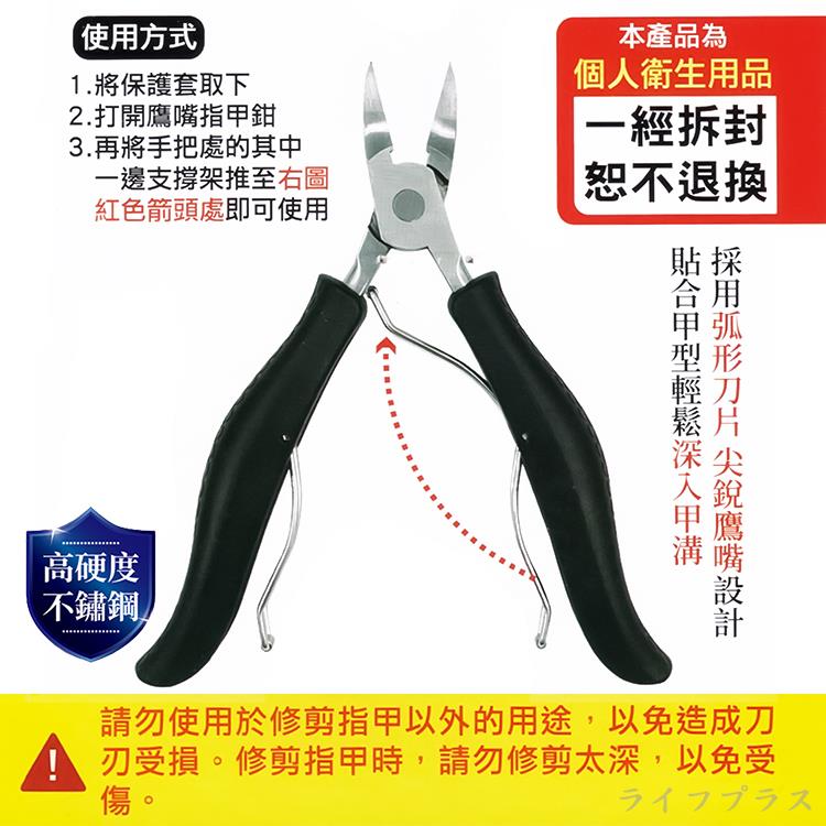 高硬度不鏽鋼材質,採用弧形刀片尖銳鷹嘴設計,貼合甲型輕鬆深入甲溝,鋒利刀刃,適合灰指甲、甲溝、厚硬指甲專用,附保護套。