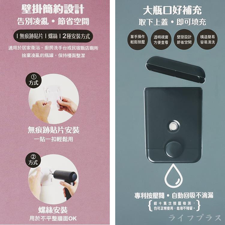 讓你的浴室更整齊,不需要觸碰,只需按壓,可以使用洗髮精、沐浴乳、洗手乳、洗碗精等各種補充液,內附無痕貼片,黏貼性強不殘膠不傷牆面,免釘免鑽孔簡單組裝,可隨意黏貼瓷磚、大理石、木板、塑膠、金屬方便實用,不平整牆面可以螺絲安裝固定,簡約時尚的設計,讓你的浴室煥然一新。