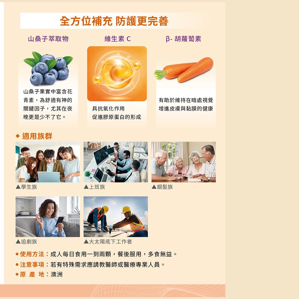 這款山桑子葉黃素膠囊與別的品牌相同名稱不同配方,採取特殊配方- 維生素C、葉黃素、β- 胡蘿蔔素、山桑子萃取物。