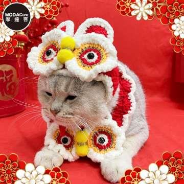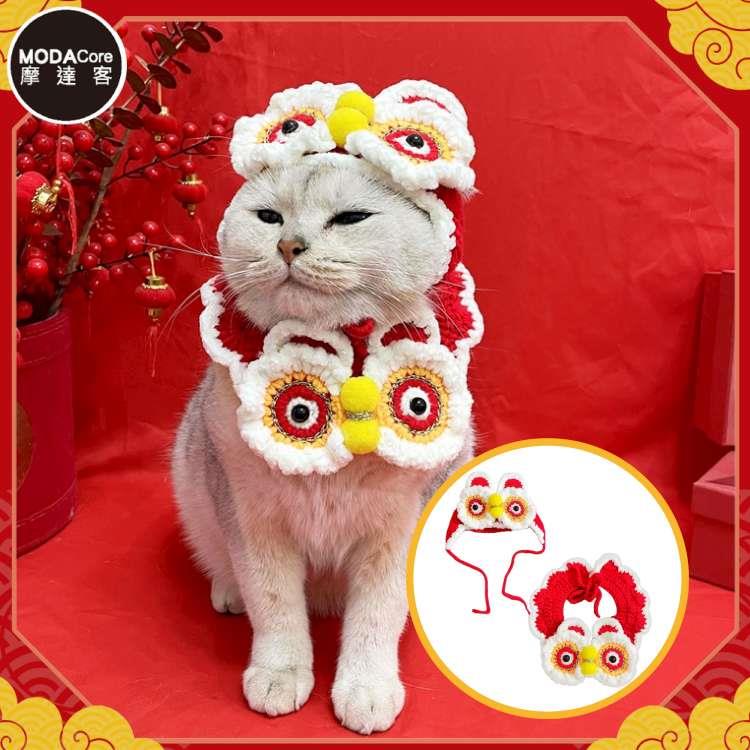 摩達客寵物-新春開運喜氣紅色醒獅帽子圍脖兩件組(變身系列貓咪狗狗適用)-2種尺寸可選