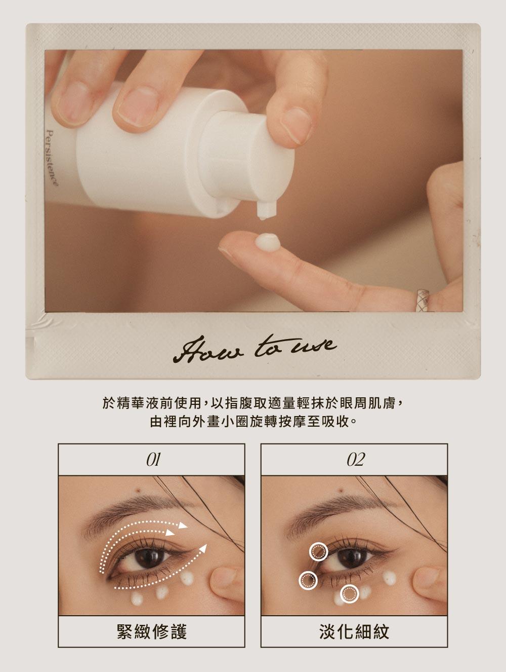 用法|以指腹取適量輕抹於眼周肌膚,由裡向外畫小圈旋轉按摩至吸收。