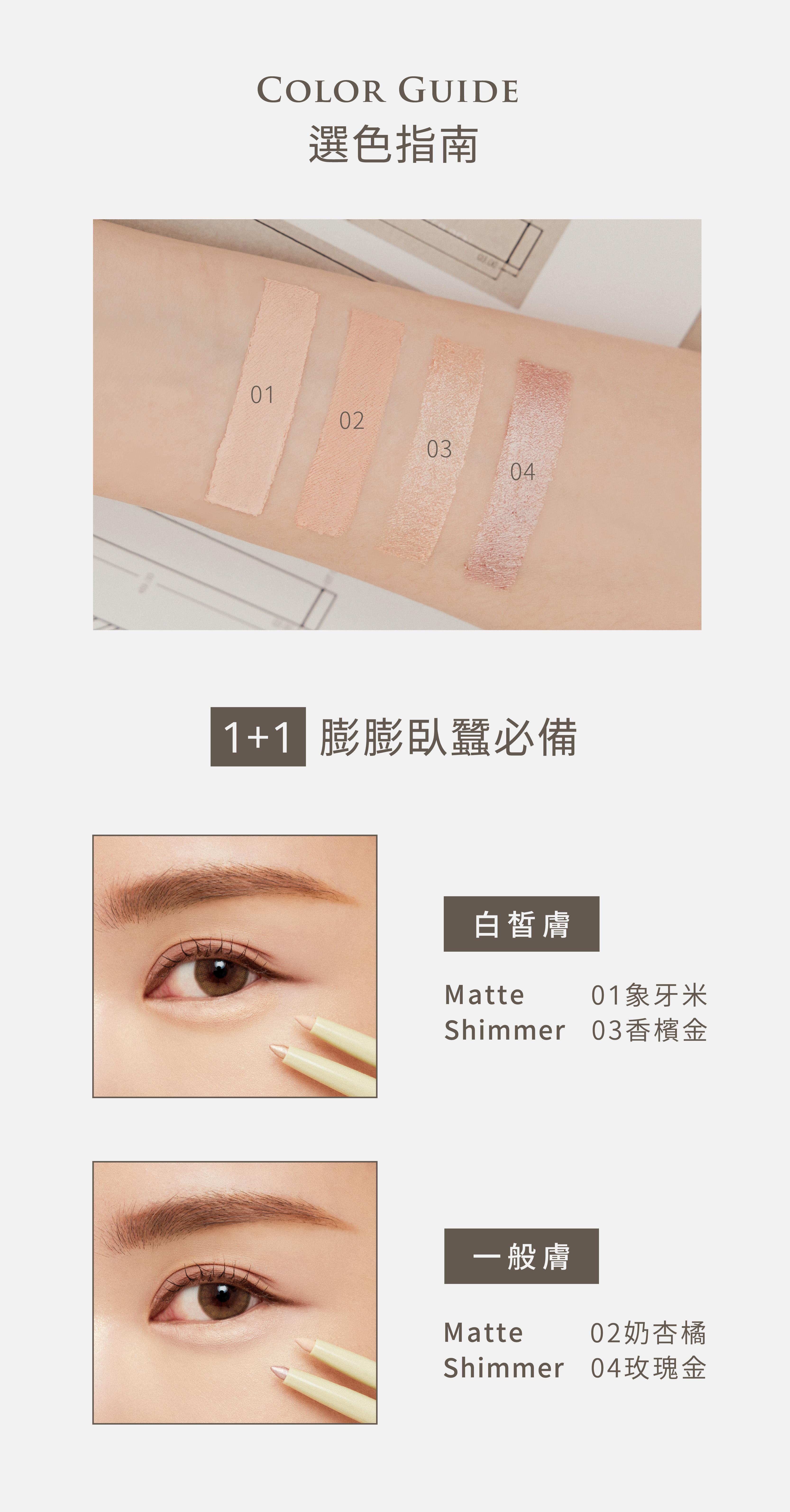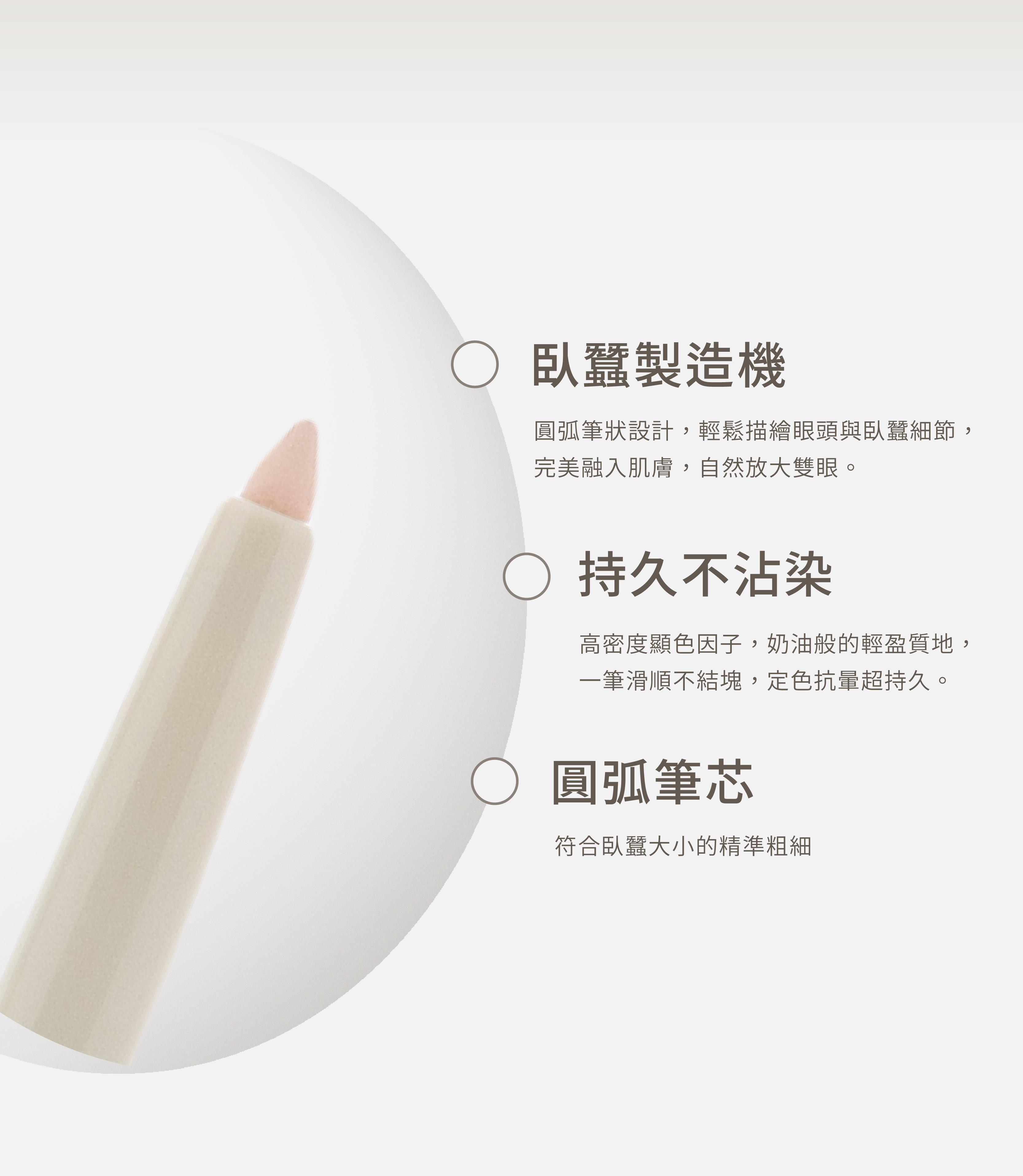 圓弧筆狀設計,輕鬆描繪眼頭與臥蠶細節,搭配高密度顯色因子,奶油般的輕