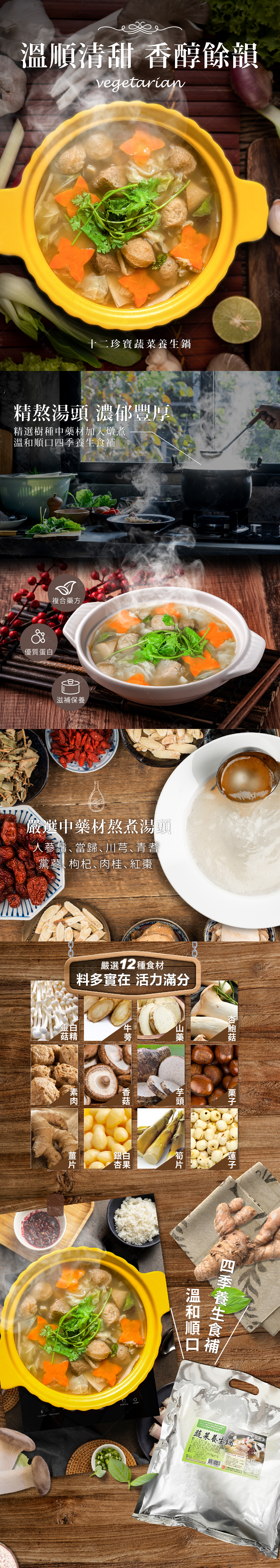 採獨家配方熬煮,湯頭清甜回甘,搭配山藥、芋頭、杏包菇等多樣高品質新鮮蔬食,及特製素肉片、素肉丸,食材豐盛美味,可說是「素食界的佛跳牆」。做為火鍋湯底清爽、不膩口,健康美味,喜愛吃鍋的老饕們,絕不能錯過這款豐盛、高CP的養生湯底!