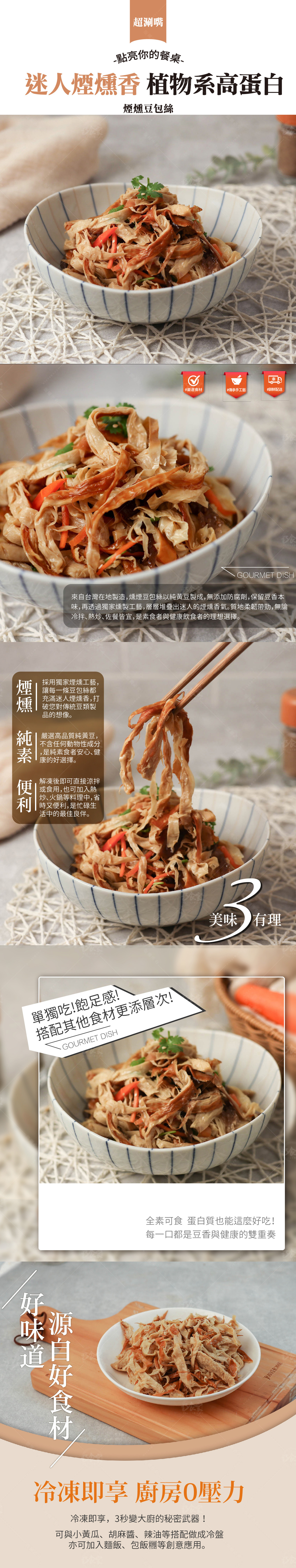 豆包細細切絲後以低溫慢火煙燻入味稚,口感Q彈帶勁,絲絲入味、香氣濃郁。無論是涼拌或快炒,都能品嚐到自然豆香與獨特煙燻風味。健康植物蛋白來源,素食可食,兼顧美味與營養!👍