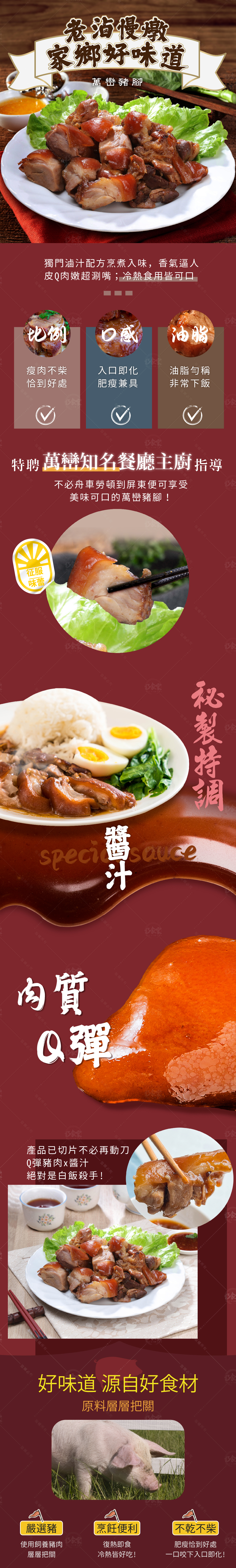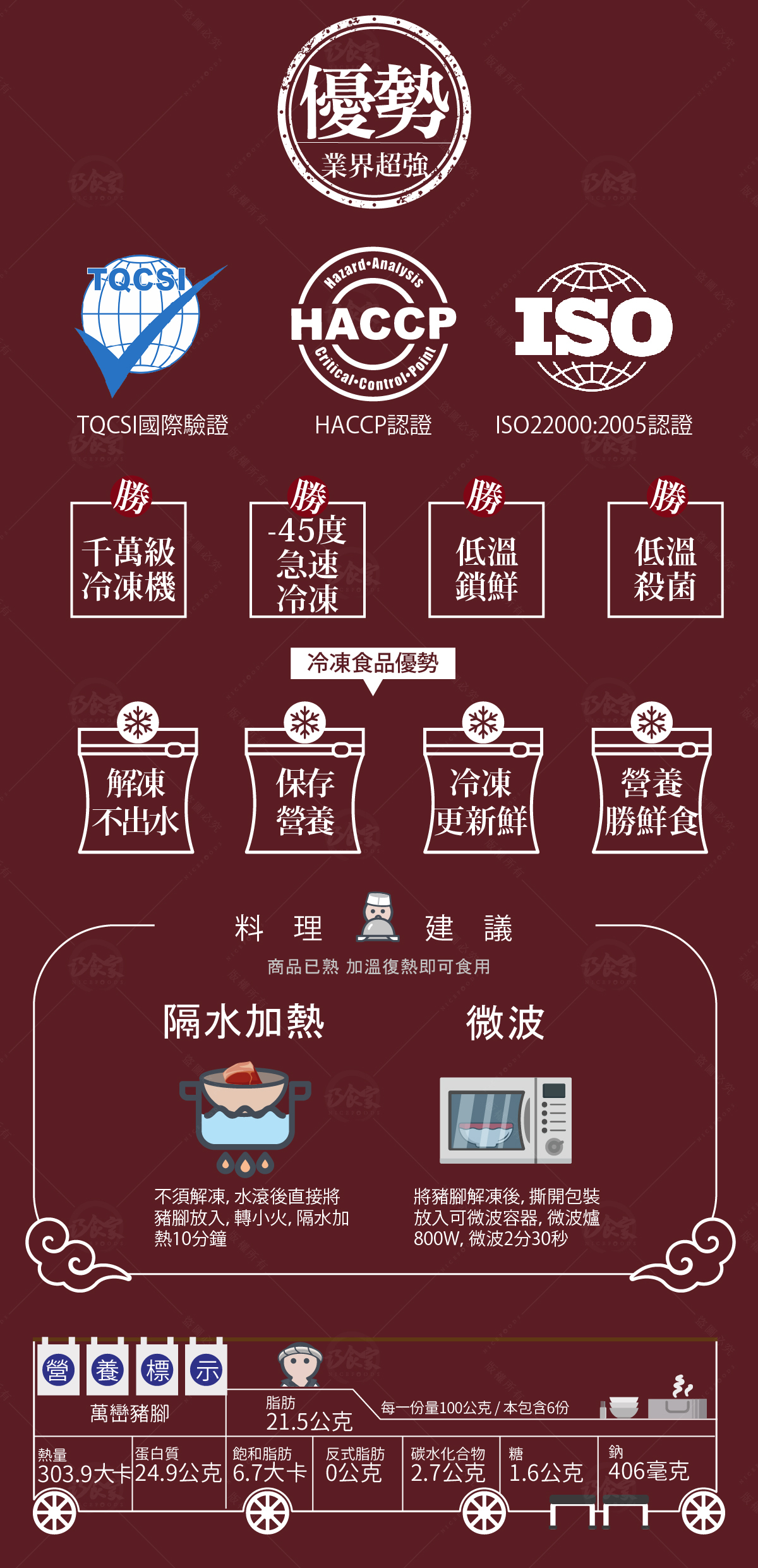 巧食家特聘萬巒知名餐廳主廚指導;不必舟車勞頓到屏東萬巒便可享受美味可口的萬巒豬腳!😍 嚴選高品質豬肉,以特製的獨門滷汁配方烹煮入味,香氣逼人、皮Q肉嫩超涮嘴;冷食熱食皆可口。