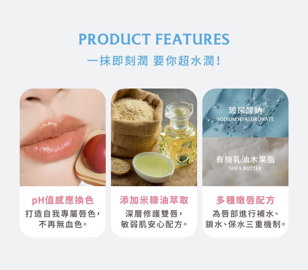 高效潤澤自然換色,輕巧好攜帶,同時為唇部進行補水、鎖水、保水三重機制