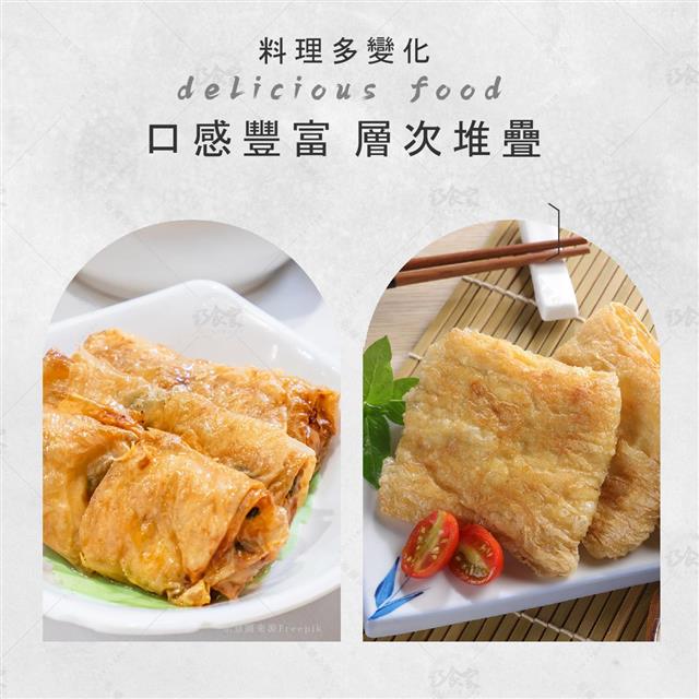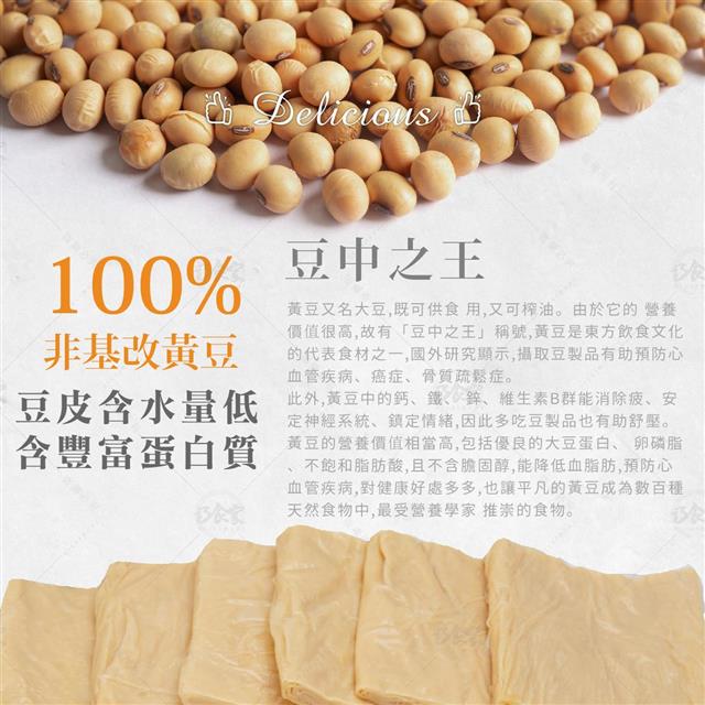 100%採用非基改黃豆,豆香濃厚,富含蛋白質,營養又美味。本商品獨家採用豆漿皮製作,層次堆疊出與眾不同的創新口感!燒烤、滷、炸、炒、煎都合適,輕鬆料理即可上桌,絕對是家常料理的極佳選擇!👍