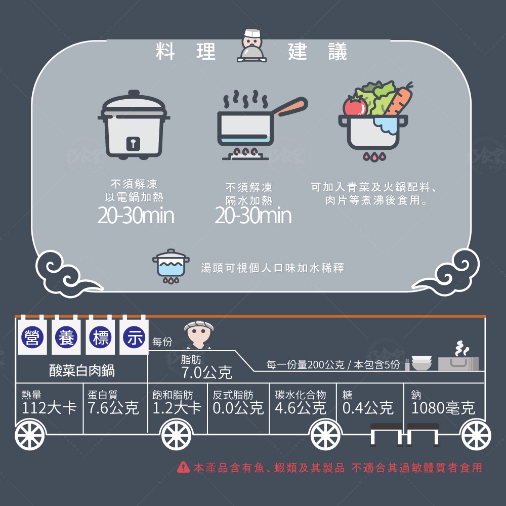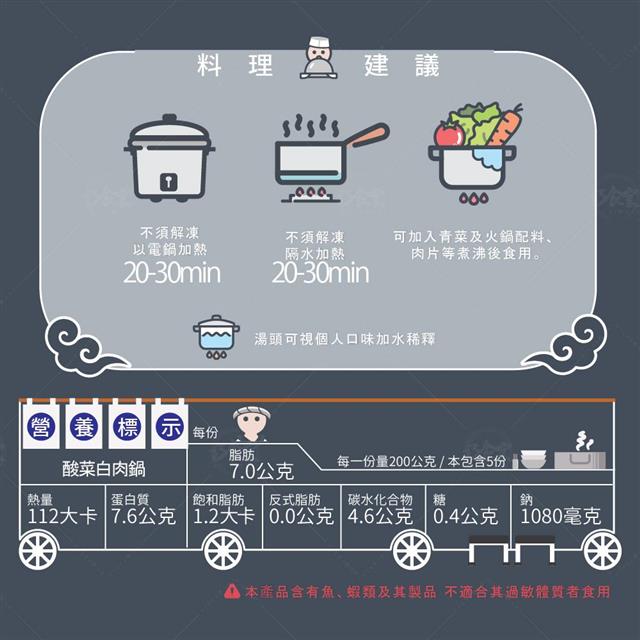 【成分】水、酸白菜、豬肉片、豆皮、食鹽、醋、調味劑 (蘋果酸、L-麩酸鈉、胺基乙酸、檸樣酸納、5'-次黃 嘌呤核苷磷酸二鈉、5'-烏嘌呤核苷磷酸二鈉、琥珀 酸二納)