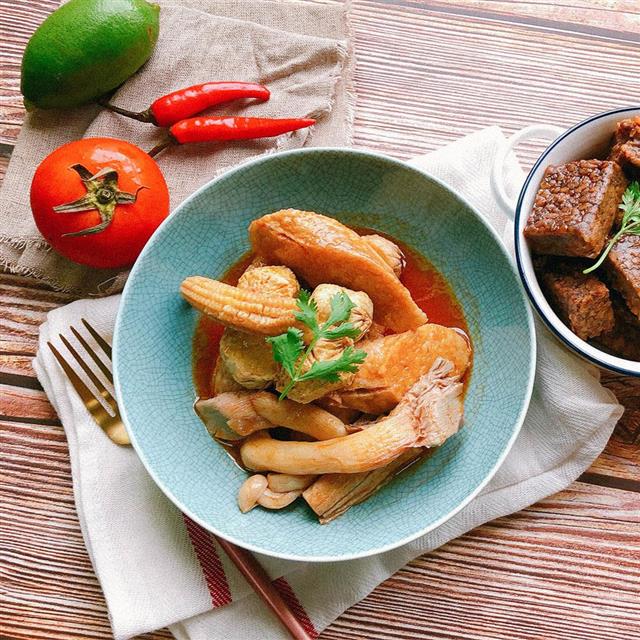 【主成分】板栗米腸、蒟蒻粉、大豆油、板栗、黃金魚蛋、咖哩粉、翡翠丸、秀珍菇、白靈菇、玉米筍、小麥豆捲。