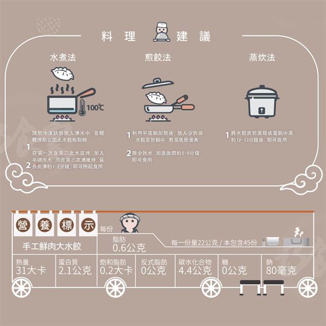 1.請於冷凍狀態放入沸水中,並輕輕攪動以防止水餃相黏結
