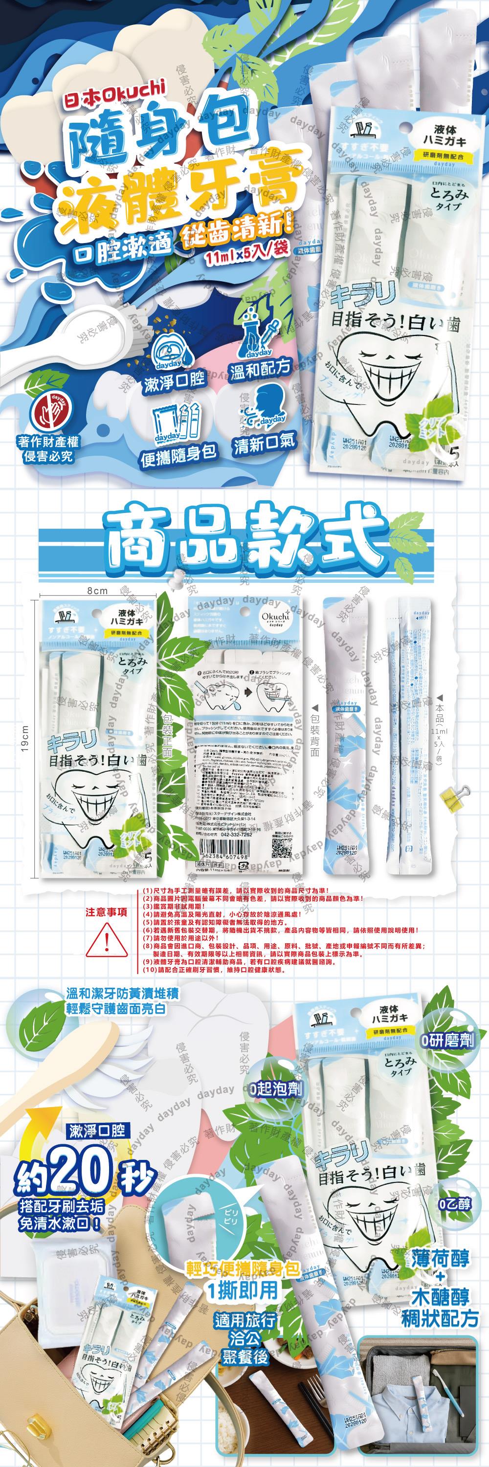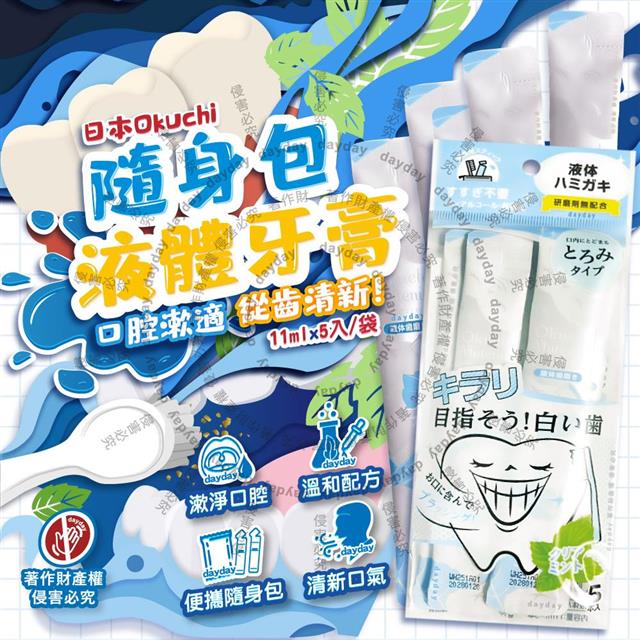 日本Okuchi-溫和清潔口腔防異味隨身包液體牙膏11mlx5入/1袋-亮白薄荷(木醣醇口內洗淨液/便攜獨立包裝漱口水/口氣清新潔齒液/無添加研磨劑)