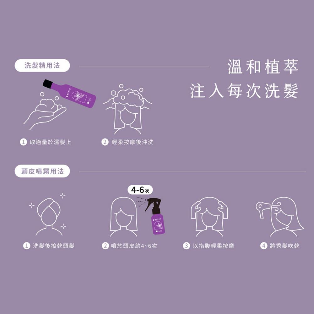 .用法:洗髮後擦乾頭髮,噴於頭皮約4~6次,以指腹輕柔按摩後將秀髮吹乾。