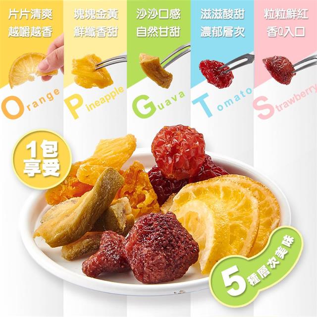 成分:鳳梨乾(鳳梨/糖)、芭樂乾(芭樂/糖)、番茄乾(番茄/糖)、香橙乾(香橙/糖)、番茄乾(番茄/糖)、草莓乾(草莓/糖)