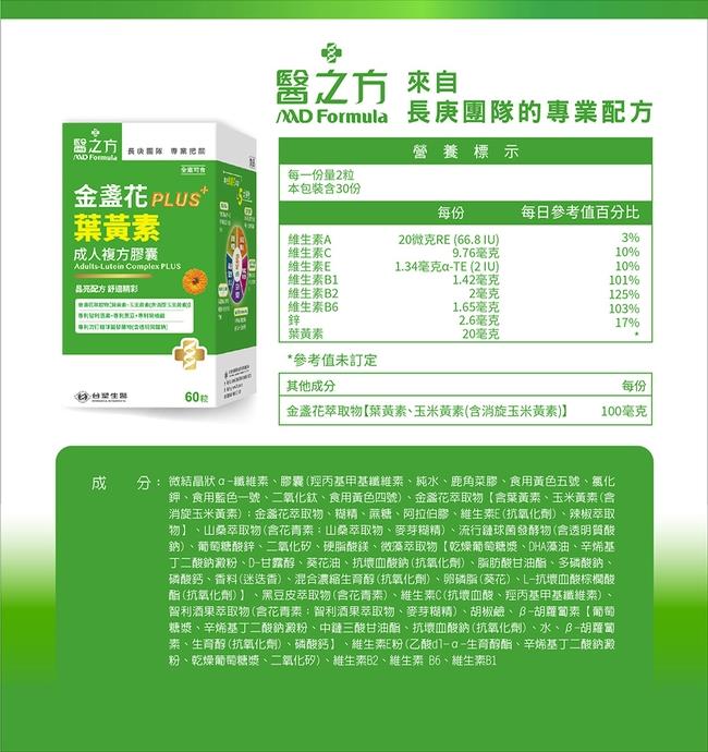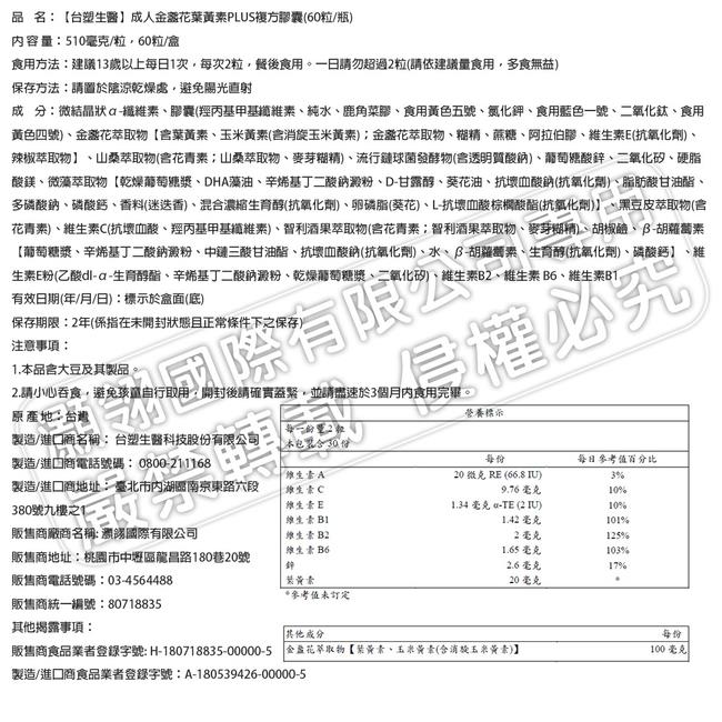 品 名:【台塑生醫】成人金盞花葉黃素PLUS複方膠囊(60粒/瓶)