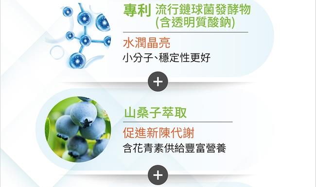 成 份:微結晶狀α-纖維素、膠囊(羥丙基甲基纖維素、純水、鹿角菜膠、食用黃色五號、氯化鉀、食用藍色一號、二氧化鈦、食用黃色四號)、金盞花萃取物【含葉黃素、玉米黃素(含消旋玉米黃素);金盞花萃取物、糊精、蔗糖、阿拉伯膠、維生素E(抗氧化劑)、辣椒萃取物】、山桑萃取物(含花青素;山桑萃取物、麥芽糊精)、流行鏈球菌發酵物(含透明質酸鈉)、葡萄糖酸鋅、二氧化矽、硬脂酸鎂、微藻萃取物【乾燥葡萄糖漿、DHA藻油、辛烯基丁二酸鈉澱粉、D-甘露醇、葵花油、抗壞血酸鈉(抗氧化劑)、脂肪酸甘油酯、多磷酸鈉、磷酸鈣、香料(迷迭香)、混合濃縮生育醇(抗氧化劑)、卵磷脂(葵花)、L-抗壞血酸棕櫚酸酯(抗氧化劑)】、黑豆皮萃取物(含花青素)、維生素C(抗壞血酸、羥丙基甲基纖維素)、智利酒果萃取物(含花青素;智利酒果萃取物、麥芽糊精)、胡椒鹼、β-胡蘿蔔素【葡萄糖漿、辛烯基丁二酸鈉澱粉、中鏈三酸甘油酯、抗壞血酸鈉(抗氧化劑)、水、β-胡蘿蔔素、生育醇(抗氧化劑)、磷酸鈣】、維生素E粉(乙酸dl-α-生育醇酯、辛烯基丁二酸鈉澱粉、乾燥葡萄糖漿、二氧化矽)、維生素B2、維生素 B6、維生素B1