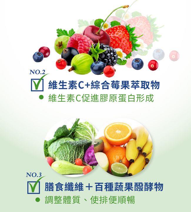 成    份:難消化性麥芽糊精、大麥草粉、氧化鎂、綠藻粉、小麥草粉、二氧化矽、維生素C、綜合蔬果醱酵物{玉米來源可溶性纖維、巴西蘑菇子實體(Agaricus Blazei Murill;固態培養)、蘆筍、玉竹、杜仲葉、余甘子、無花果、四季豆、薑黃、刺五加、決明子、車前草、洋甘菊花、洋甘菊葉、桔梗、黑木耳、貓爪藤萃取物、高麗菜、番石榴、番石榴葉、枸杞、枸杞葉、熊世、葡萄、葡萄柚、牛蒡、香菜、紫蘇葉、紫蘇種子、生薑、馬尾草、楊桃、接骨木、芹菜、蒲公英根、辣椒、魚腥草、紅棗、胡蘿蔔、忍冬、大蒜、鳳梨、香芹、百香果、薏苡仁、香蕉、青木瓜、甜椒、枇杷、枇杷葉、鹿角海蘿、菠菜、馬卡、獼猴桃、溫州蜜柑、甜瓜、豆芽、黃麻七、艾葉、龍眼花、龍眼根、蘋果、博士茶、靈芝子實體【Ganoderma lucidum (Leyss. : Fr.) Karst.;固態培養】、靈芝菌絲體【Ganoderma lucidum (Leyss. : Fr.) Karst.;固態培養】、檸檬、連錢草、蓮霧、大豆、山藥、洋蔥、甘草、昆布、松樹葉、金桔、柿葉、桑葉、桑樹果實、梅、梨、黑豆、香菇、抹茶、蓮藕、羅漢果、金銀花、杏核}、綜合酵素【酵素製劑(澱粉分解酵素、蛋白分解酵素、脂肪分解酵素、乳糖分解酵素、纖維分解酵素)、麥芽糊精】、甜菊複合粉【甜菊醣苷(甜味劑)、乳糖】、綜合莓果萃取物(蘋果、草莓、葡萄、覆盆莓、藍莓、山桑、蔓越莓、櫻桃、野櫻莓、桑椹、黑加侖、黑莓、楊梅、接骨木莓、麥芽糊精)、野櫻莓萃取物(野櫻莓萃取物、麥芽糊精)、綜合蔬果醱酵物(黑糖、果糖、葡萄糖、蘋果、柿子、香蕉、鳳梨、白米、糙米、糯米、栗、大麥、黍、玉米、蜜柑、八朔蜜柑、臍橙、檸檬、夏蜜柑、金柑、文旦、椪柑、柚子、大豆、黑芝麻、白芝麻、黑豆、胡蘿蔔、大蒜、牛蒡、百合、蓮藕、葡萄、無花果、山葡萄、楊梅、草莓、烏梅、羊栖菜、裙帶菜、海苔、昆布、蜂蜜、核桃、澱粉、胡瓜、芹菜、紫蘇)、蔗糖素(甜味劑)
