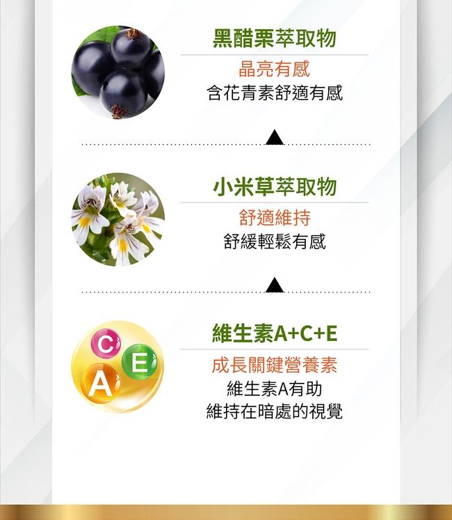 營養標示:(每一份量2錠/本包裝含30份)維生素A 750微克RE (2500 IU),維生素C 100毫克,維生素E 6.7毫克α-TE (10 IU),葉黃素 12毫克
