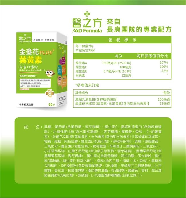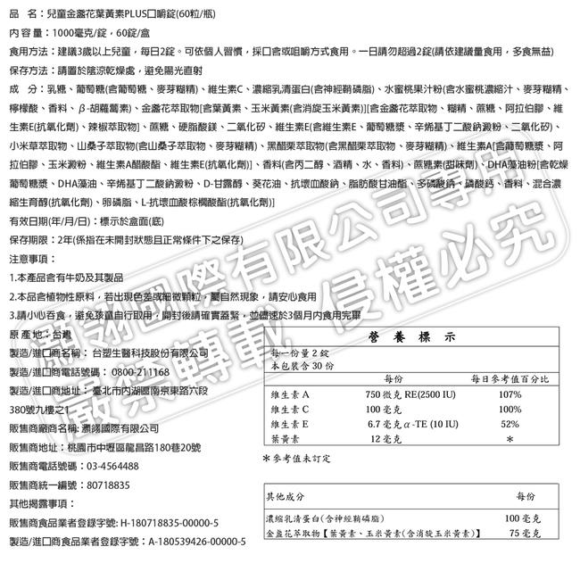 品    名:【台塑生醫】兒童金盞花葉黃素PLUS口嚼錠(60粒/瓶)