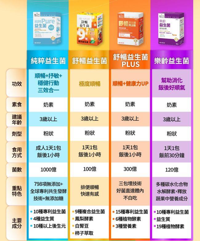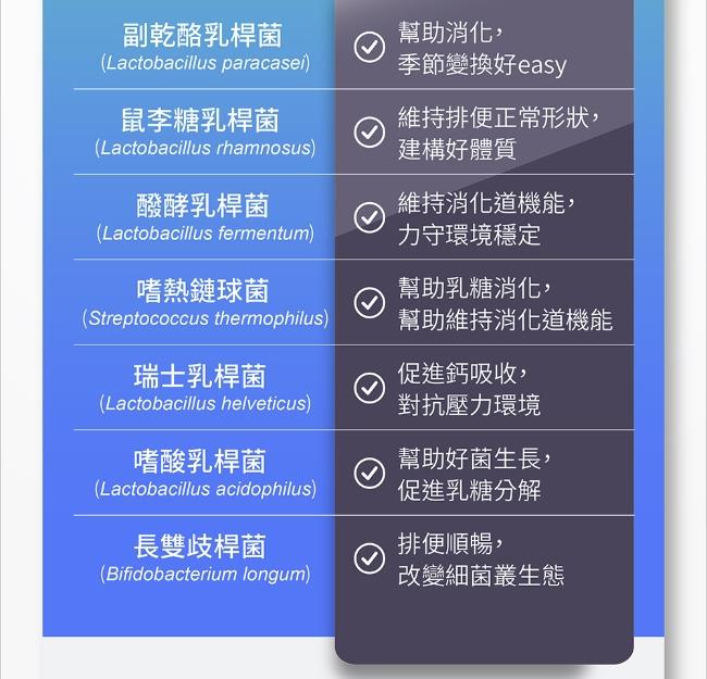 成 分:果寡醣粉(非基改玉米澱粉、果寡醣)、乳酸菌 (Lactobacillus plantarum LP28, Lactobacillus fermentum LF26, Lactobacillus paracasei LPC12, Lactobacillus rhamnosus LRH10, Lactobacillus helveticus LH43, Streptococcus thermophilus ST30, Lactobacillus plantarum TWK10, Bifidobacterium longum BL986, Lactobacillus acidophilus LA1063, Lactobacillus rhamnosus LRH113)、木寡糖、菊糖、玉米來源可溶性纖維