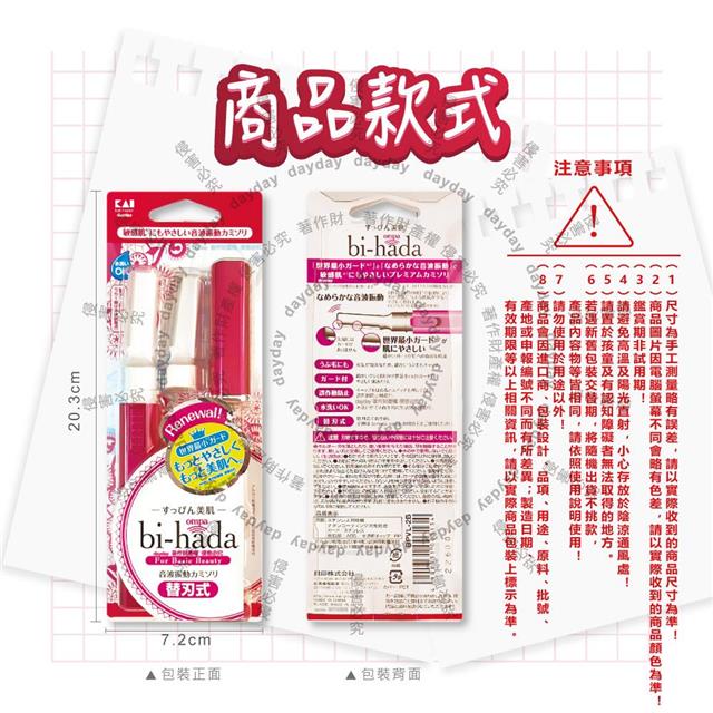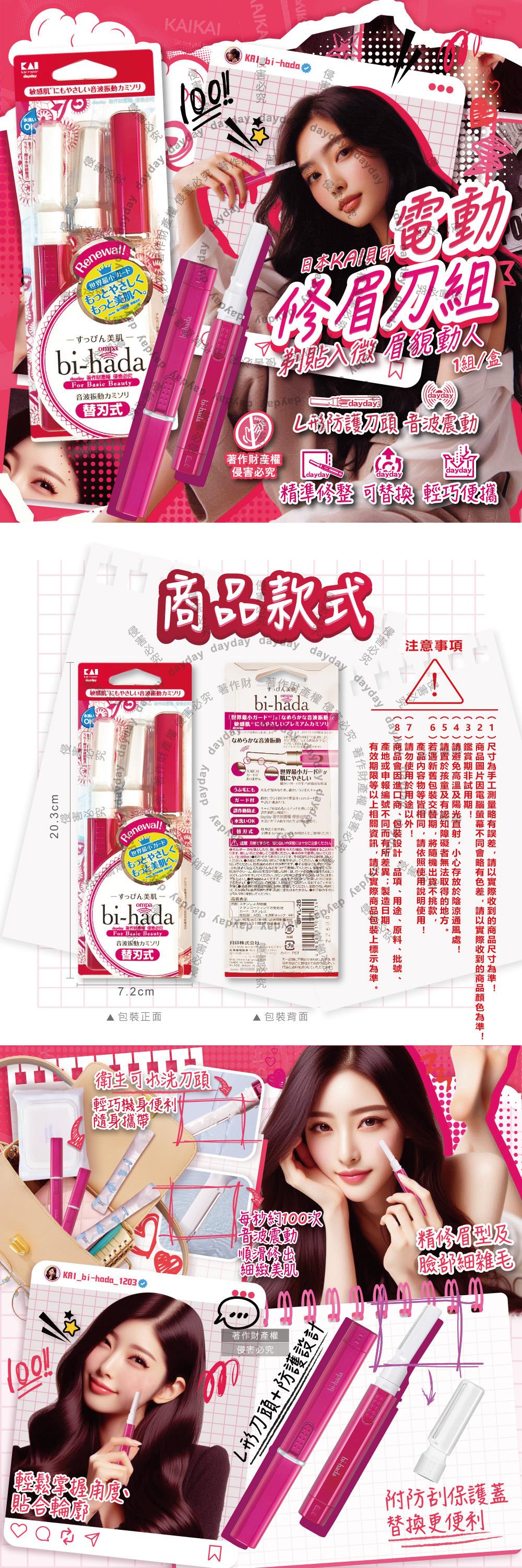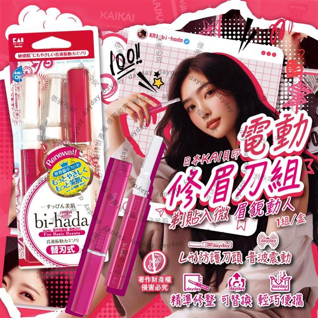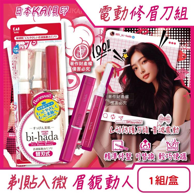 日本KAI貝印-bi-hada音波電動修眉刀組-L型BPVL-2B刀柄1入+替換刀頭2入/盒(電池式附保護蓋便攜/精緻眉型可替換美容刀/可水洗仕女修容刀)