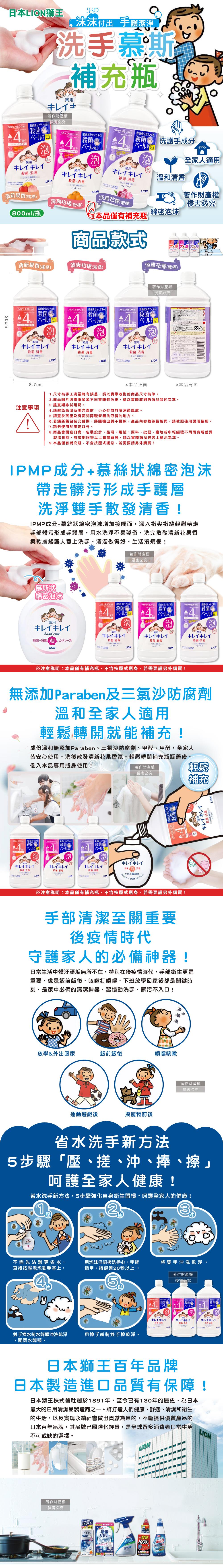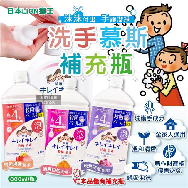 日本LION獅王-溫和潔淨去味植萃香氛濃密泡沫洗手慕斯補充瓶800ml/1瓶(綿密泡泡去污洗手乳/手部護理清潔/家庭用芳香淨膚潔手液/全家人適用)