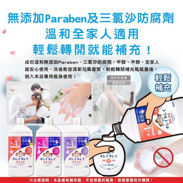 ●無添加Paraben及三氯沙防腐劑,溫和全家人適用,輕鬆轉開就能補充!