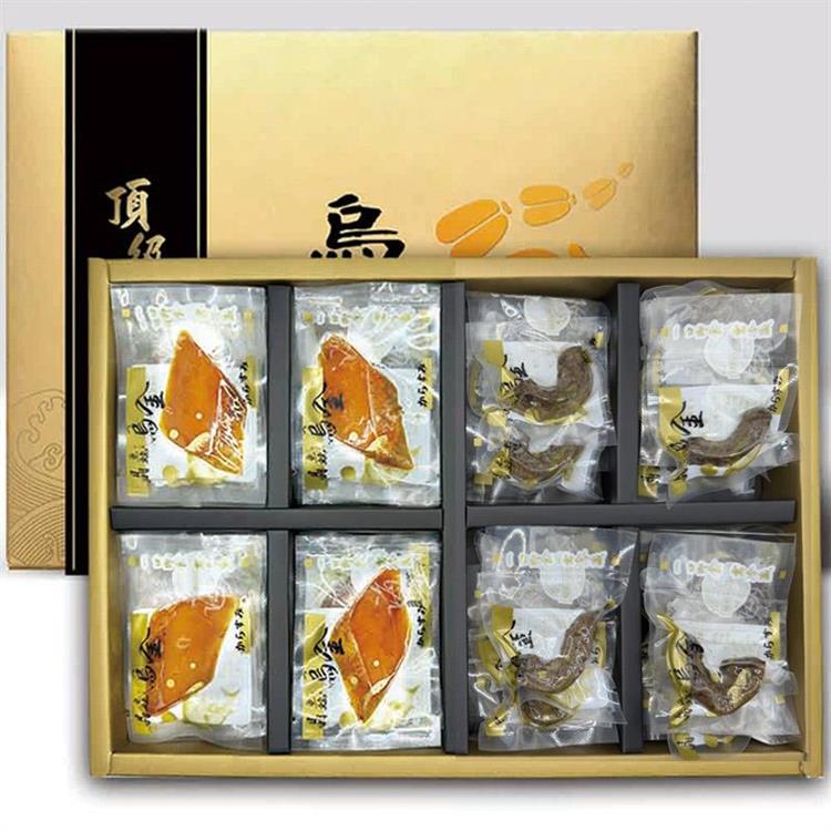 商品品名:晶鱻烏金 一口烏魚子150G+炭烤烏魚腱150G 金賞禮盒+提袋